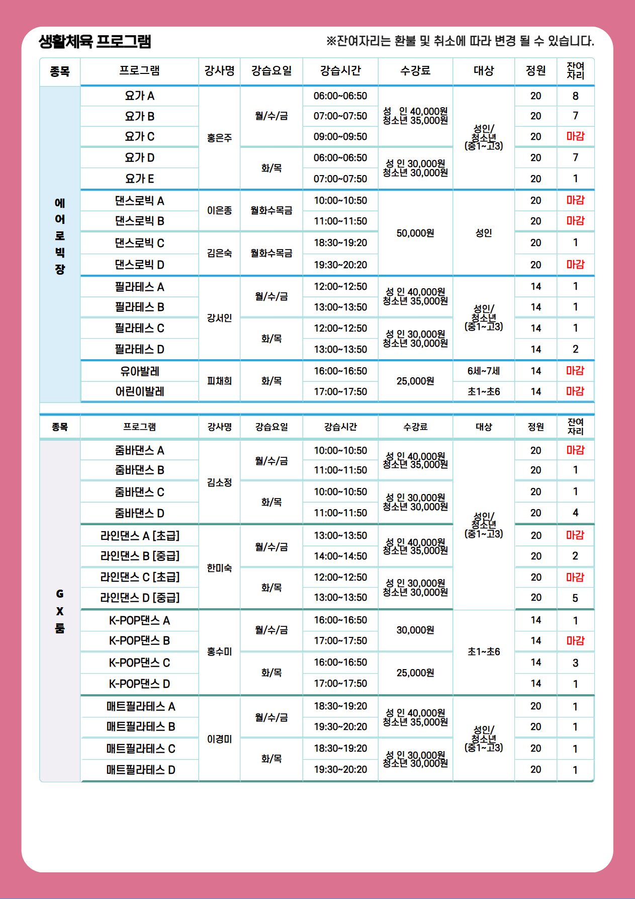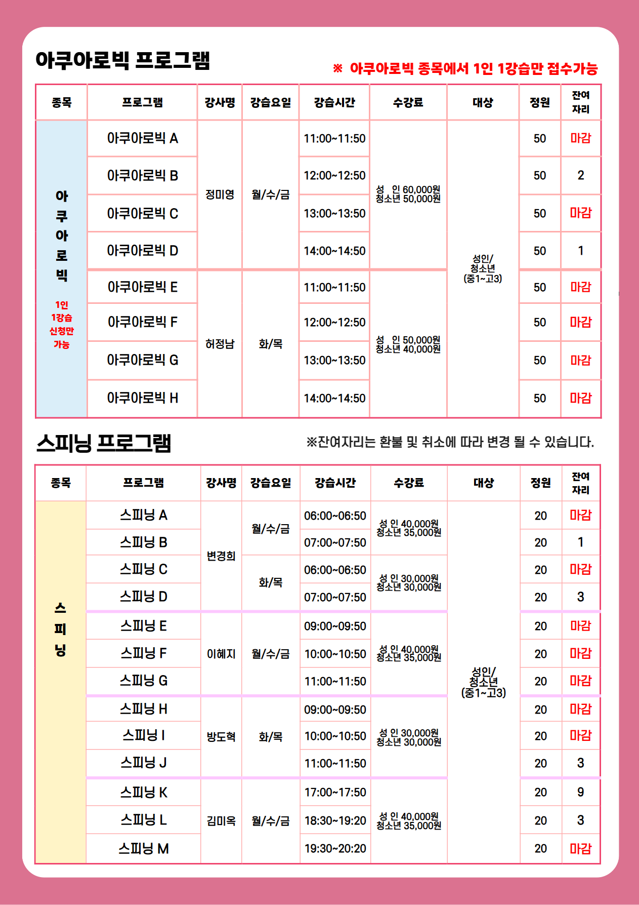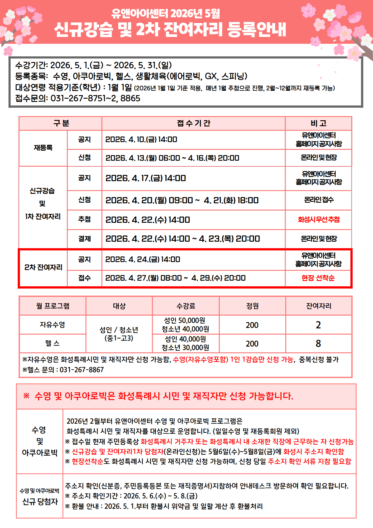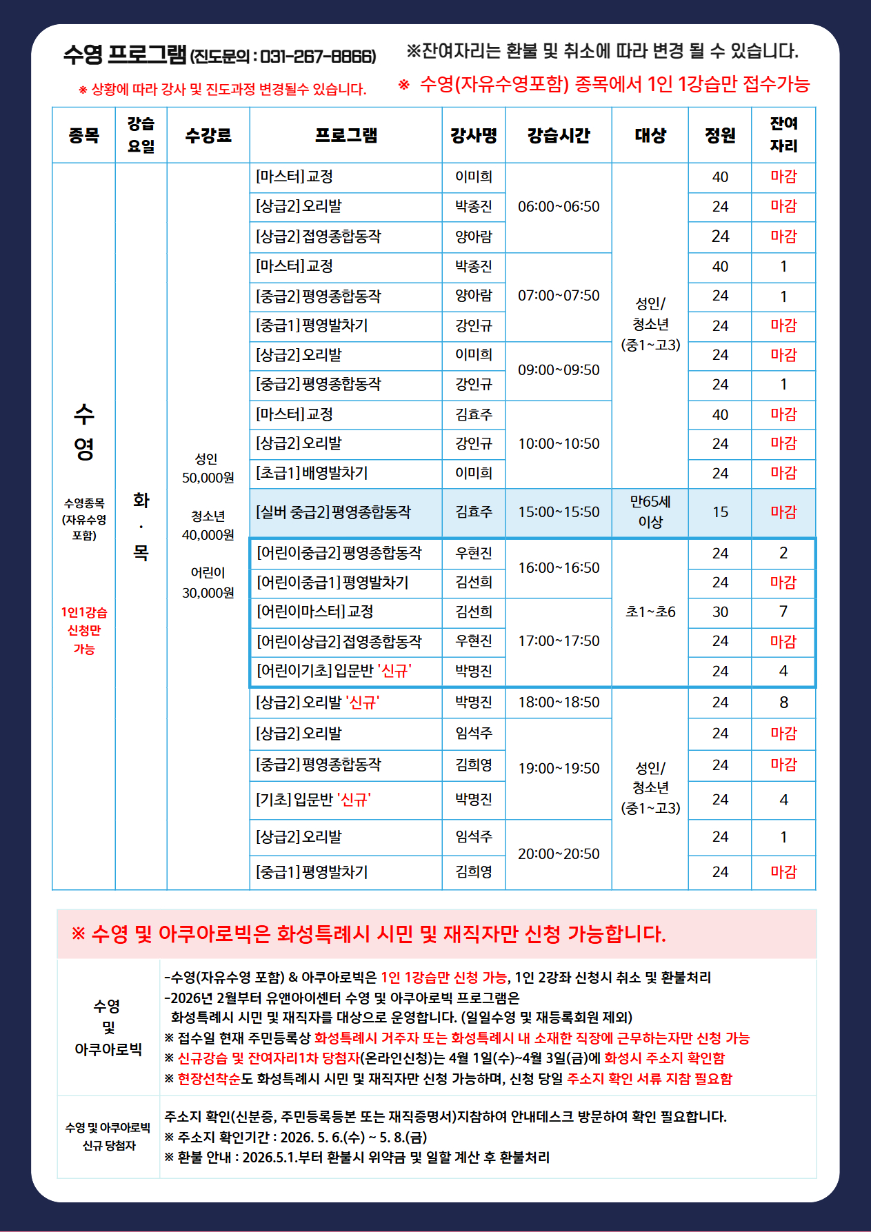 | 제목 | 2026년 5월 스포츠프로그램 신규강습 및 2차 잔여자리 등록안내 [수영, 아쿠아로빅, 헬스, 에어로빅, GX, 스피닝] | ||
