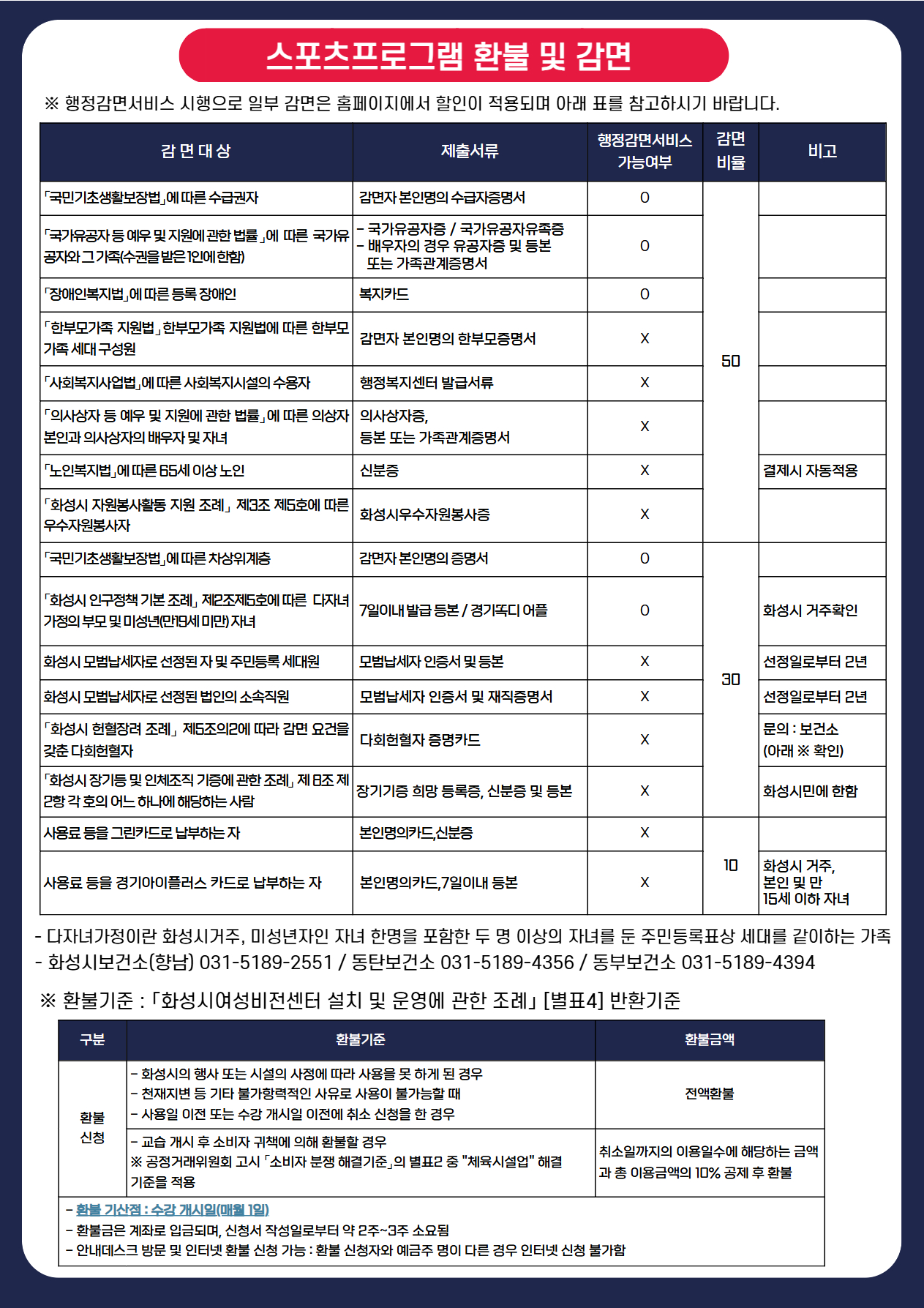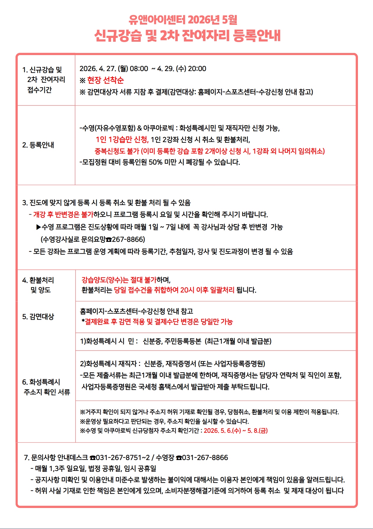 ※수영 및 아쿠아로빅은 화성특례시 시민 및 재직자만 신청가능합니다. 2026년 2월부터 유앤아이센터 수영 및 아쿠아로빅 프로그램은 화성특례시 시민 및 재직자만을 대상으로 운영합니다. (일일수영 및 재등록회원 제외) 현장선착순 접수일(2026. 4. 27~4.29)에 必 주소지 확인 서류 지참하여야 신청 가능합니다. 주소지확인 제출서류 1. 화성특례시 시 민 : 신분증, 주민등록등본(최근 1개월 내) 2. 화성특례시 재직자 : 신분증, 재직증명서(또는 사업자등록증명원) *어린이회원은 보호자와의 관계가 등본에 미기재된 경우, 가족관계증명서 서류 지참 必 *모든 제출서류는 최근1개월 이내 발급분에 한하며, 재직증명서는 담당자 역락처 및 직인 포함, 사업자등록증명원은 국세청 홈택스에서 발급받아 제출 부탁드립니다. ※온라인 신청시, 허위 사실 기재로 인한 책임은 본인에게 있으며, 소비자분쟁해결기준에 의거하여 등록 취소 및 제재 대상이 됩니다. |
