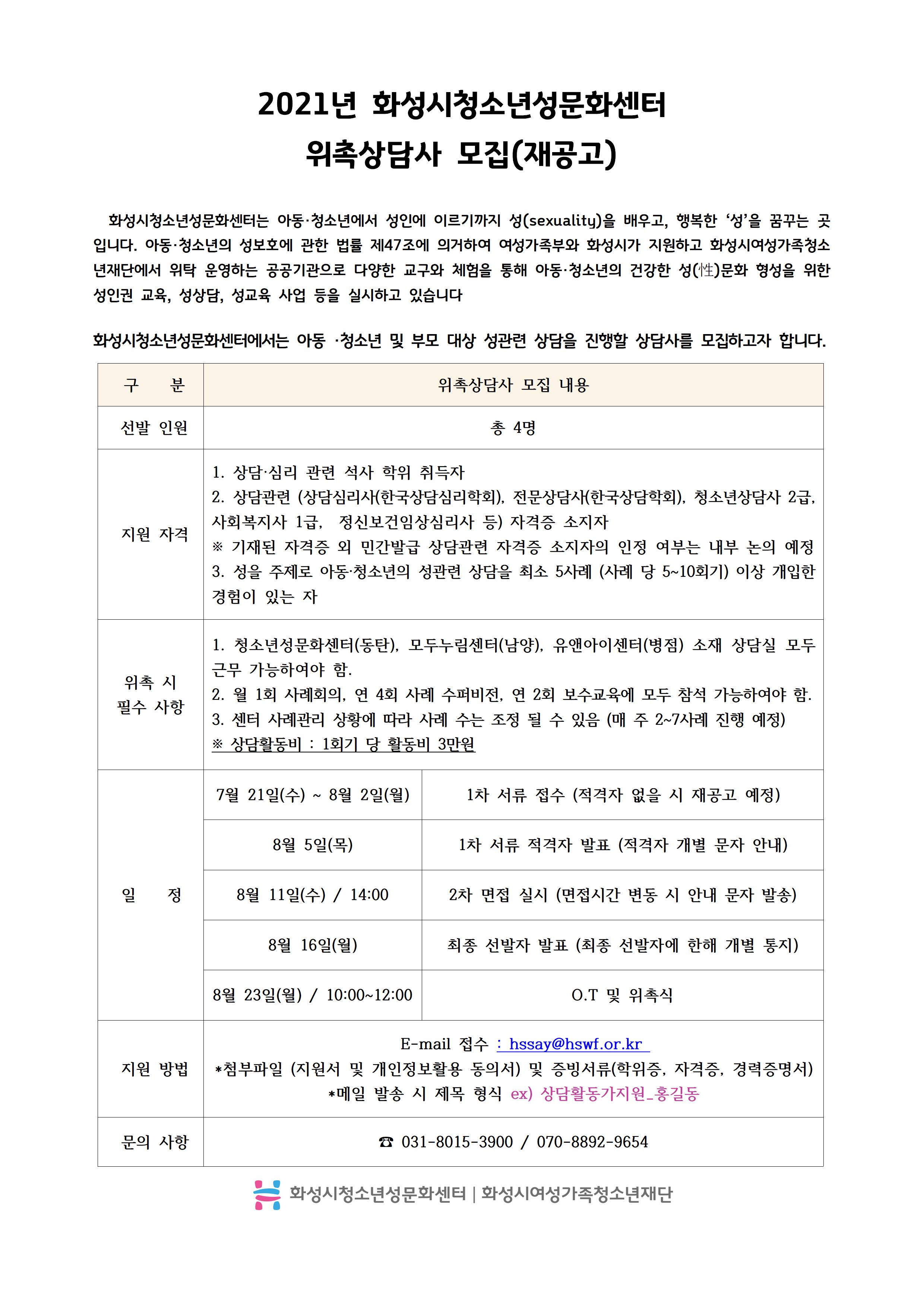 | 제목 | [화성시청소년성문화센터] 2021년 화성시청소년성문화센터 위촉상담사 모집 | ||