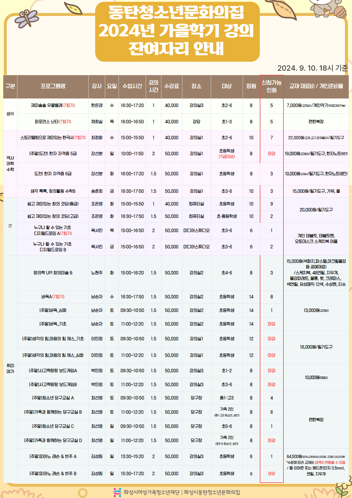 안녕하세요. 동탄청소년문화의집입니다. 2024년 교육문화프로그램 가을학기 잔여자리 안내 드립니다. 추가 접수 기간 및 방법 등 자세한 사항은 하단의 링크 참고 바랍니다.