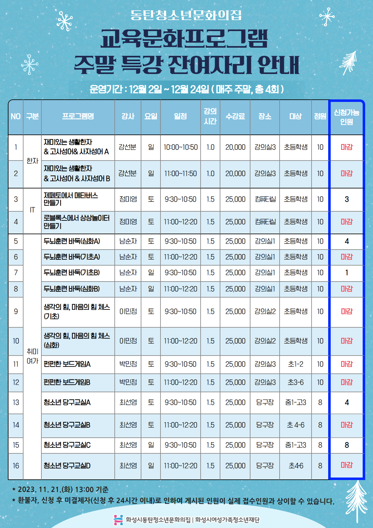 안녕하세요. 동탄청소년문화의집입니다. 2023년 교육문화프로그램 주말특강 잔여자리 안내 드립니다.