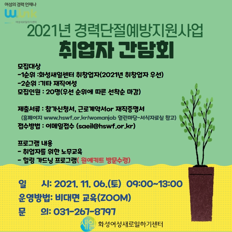제목 2021년 경력단절예방지원사업 [취업자 간담회] 2차 참여자 모집 운영센터 화성여성새로일하기센터 작성일 2021년 10월 25일 17시 26분 조회수 1,806 첨부 파일 아이콘제목을 입력하세요 (6).jpg (379.06KB)다운로드 아이콘 목록보기