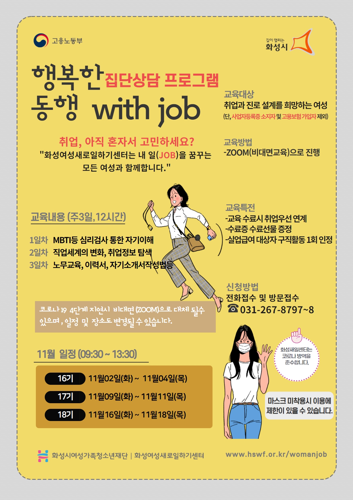 제목 2021년 집단상담프로그램 하반기 참여자 모집 운영센터 화성여성새로일하기센터 작성일 2021년 10월 25일 17시 19분 조회수 1,482 첨부 파일 아이콘4.jpg (761.61KB)다운로드 아이콘 목록보기