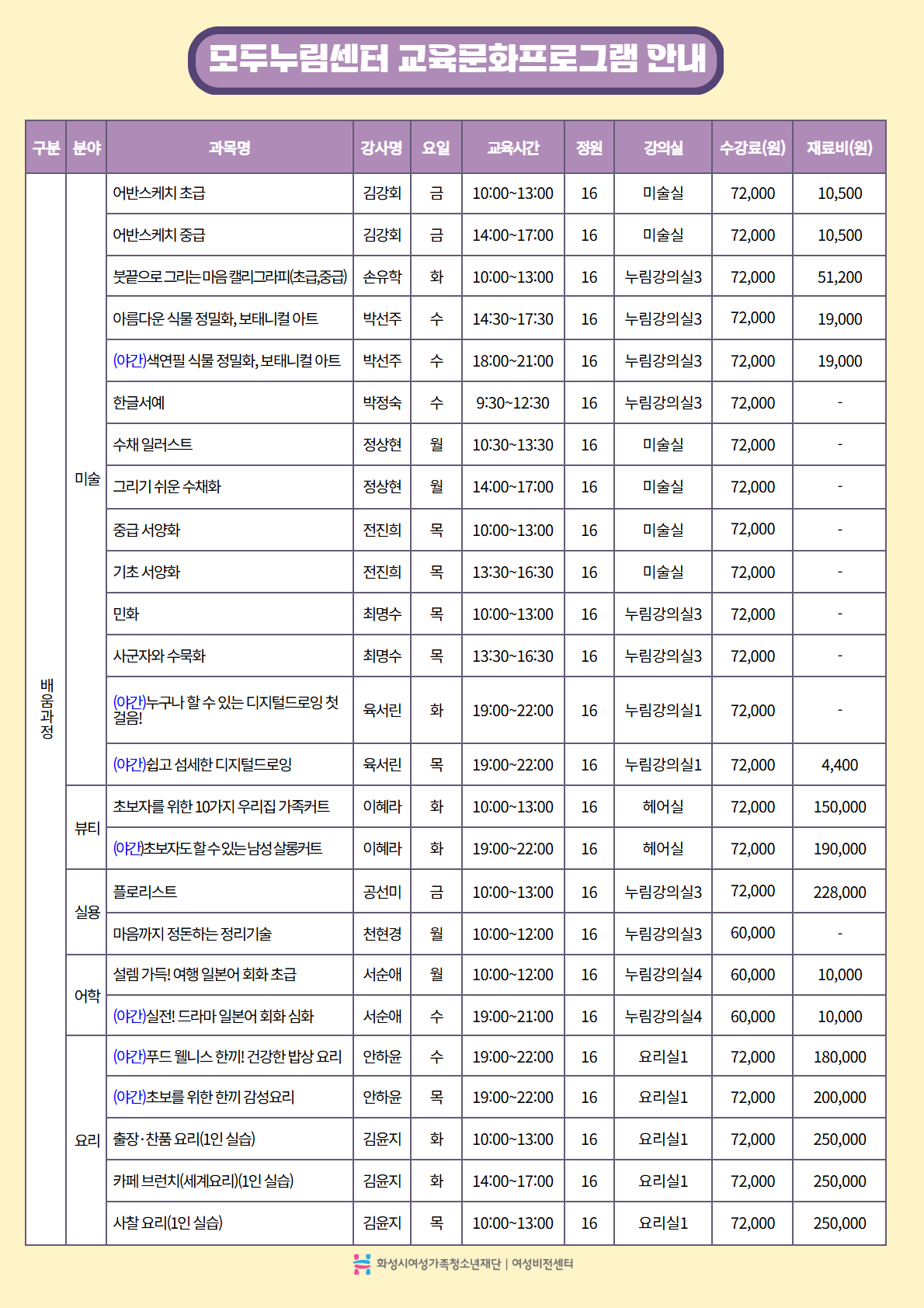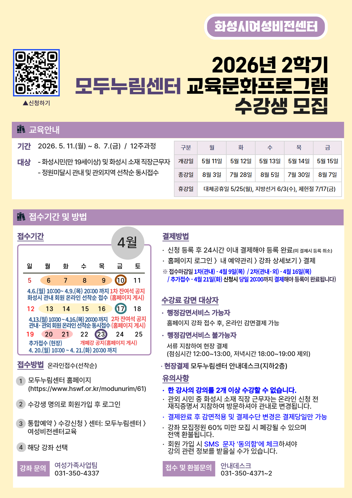 | 제목 | [화성시여성비전센터] 2026년 2학기 모두누림센터{남양} 교육 프로그램 수강생 모집(26. 4. 6.~4. 21.) | ||