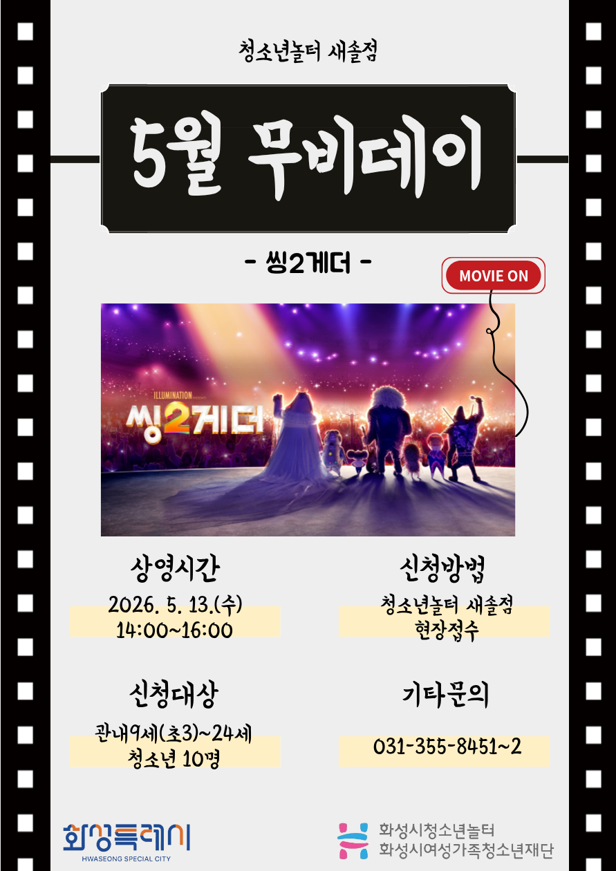 안녕하세요, 청소년놀터 새솔점입니다. 5월 무비데이 안내드립니다. 상영작: 씽2게더 상영시간: 5. 9.(수) 14:00~16:00 신청방법: 청소년놀터 새솔점 당일 현장접수 신청대상: 관내 9세(초3)~24세 청소년 10명 많은 관심 부탁드립니다. ?