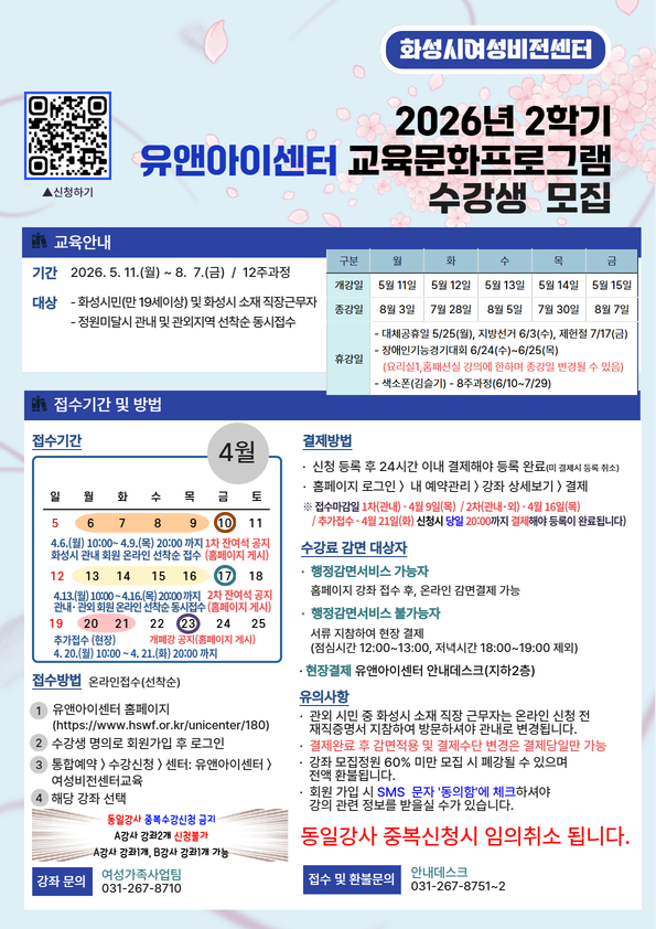 제목 [화성시여성비전센터] 2026년 2학기 유앤아이센터 교육 프로그램 수강생 모집(26. 4. 6.~4. 21.)