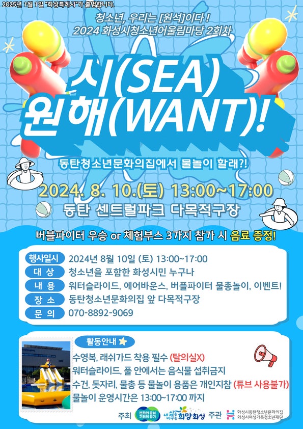 무덥고 습한 여름.. 어디론가 놀러 가기에는 시간이 없고.. 물놀이는 하고 싶은 화성시 청소년이라면.. . . .. . 8월 10일(토) "시(SEA)원해(WANT)"로 놀러오세요!!!! 워터슬라이드, 에어바운스와 체험부스 그리고 버블파이터 물총놀이까지! 무더운 여름 화성시청소년어울림마당 "시(SEA)원해(WANT)"와 함께 더위 날려버리세요!