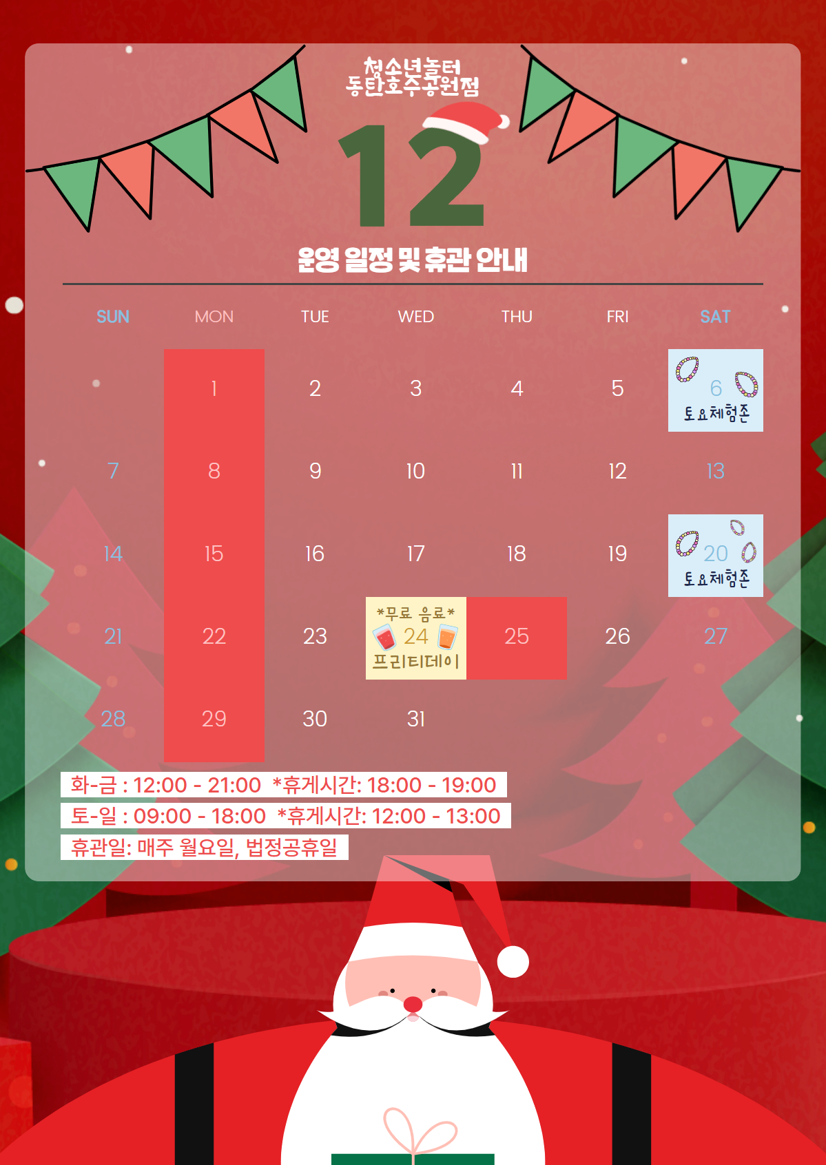제목 [청소년놀터 동탄호수공원점] 12월 운영안내 운영센터 청소년놀터 작성일 2025년 12월 2일 13시 27분 조회수 43 첨부 파일 아이콘12월 운영안내 및 휴관.jpg (1.13MB)다운로드 아이콘 안녕하세요 청소년놀터 동탄호수공원점에서 12월 운영일자 및 휴관일을 안내드립니다.문의: 031-372-6871~2? 목록보기