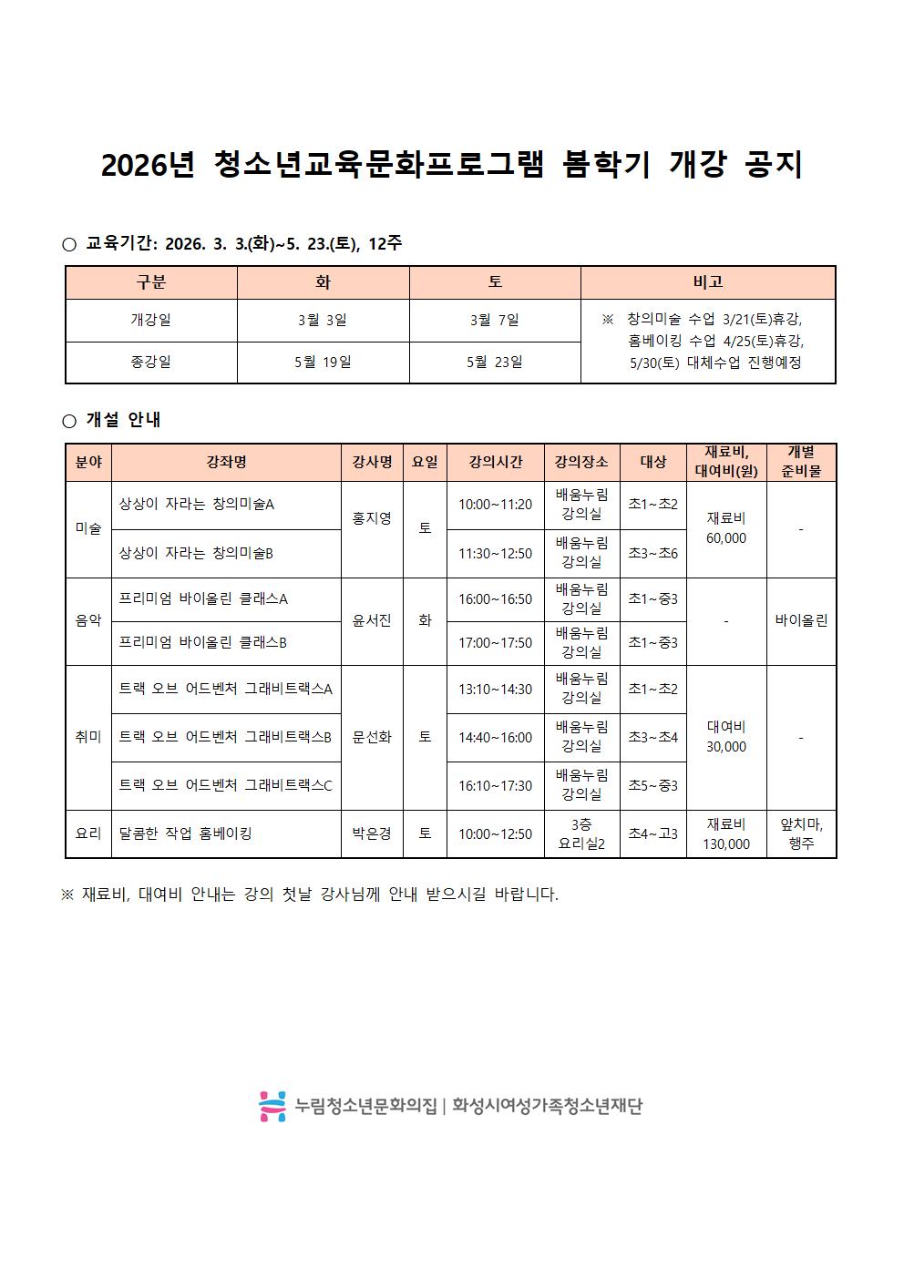 제목 [누림청소년문화의집] 2026년 봄학기 청소년교육문화프로그램 개강 안내 운영센터 모두누림센터 작성일 2026년 2월 27일 11시 5분 조회수 226 첨부 파일 아이콘2026년 청소년교육문화프로그램 봄학기 개강공지.jpg (133.64KB)다운로드 아이콘 목록보기