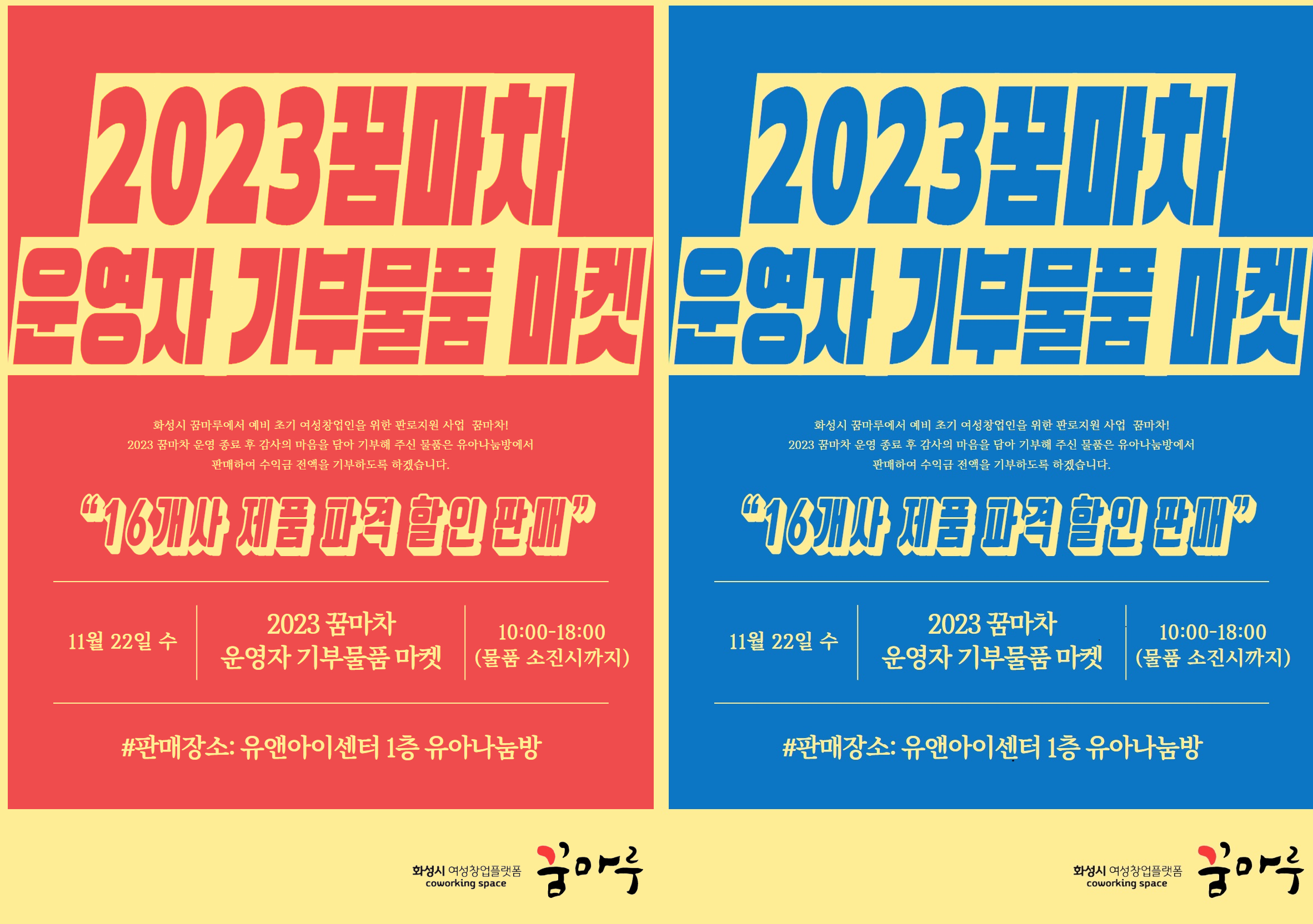 [화성시 꿈마루] 2023꿈마차 운영자 기부물품 마켓 경기 거주 여성창업인을 위한 ‘화성시 여성창업플랫폼 꿈마루’에서 예비?초기 창업자의 판로를 지원하기 위한 사업으로 2019년부터 운영하고 있는 ‘꿈마차’ 사업 2023년에도 창업의 꿈을 펼치기 위해 16명의 꿈마차 운영자가 선발되어 올 한해 동안 운영을 진행했습니다. 꿈마차 운영 종료 후 16개사 꿈마차 대표님들이 기부해 주신 물품은 ‘꿈마차 운영자 기부물품 마켓’을 통해 판매된 수익금 전액은 화성시사회복지협의회에 기부하고 있습니다. 파격 할인율이 적용된 좋은 가격으로 제품 구매도 하고 연말 기부 행사에도 참여할 수 있는 의미 있는 소비에 동참하시겠습니까? “Yes” <2023꿈마차 운영자 기부물품 마켓> 행사일시: 2023.11.22.수, 10:00~18:00 (제품 소진시까지) 판매장소: 유앤아이센터 1층 유아나눔방 앞 판매물품: 16개사 제품 총 164개