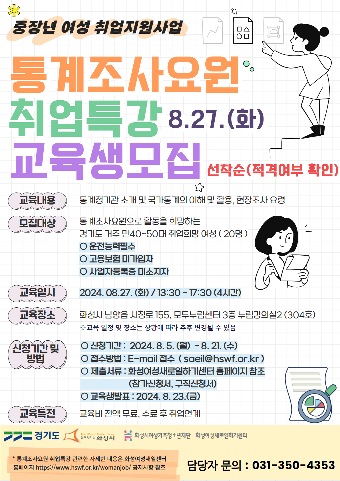 2024년 중장년 여성 취업지원 [통계조사요원 취업특강] 교육생 모집 ★ 모집마감은 8/21일(수) 24:00까지입니다. 많은 지원 부탁드립니다. ★ 1. 교육기간 및 모집인원 -교육기간 : 2024년 8월 27일(화), 13:30 ~ 17:30(1일, 4시간) -교육대상 : 경기도 거주 만40~50대 취업희망 여성 -교육인원 : 20명 2. 교육내용 및 장소 -교육내용 : 국가통계의 이해, 현장조사요령, 채용안내 및 질의응답 등 -교육장소 : 모두누림센터 3층 누림강의실2 (화성시 남양읍 시청로 155) 3. 모집선발 방법 및 일정 -선발방법 : 적격자에 한한 선착순 선발(교육신청서 및 구직신청서 확인) -접수방법 : 이메일 접수(saeil@hswf.or.kr) *메일 제목에 “통계조사요원 신청 - 이름” -제출서류 : 교육신청서, 구직신청서 1부 (화성여성새일센터 홈페이지 www.hswf.or.kr/womanjob - 열린마당 - 공지사항 첨부파일 다운로드) -접수기간 : 2024년 8월 5일(월) ~ 8월 21일(수) -교육생 발표 : 2024년 8월 23일(금), 홈페이지 게시 및 개별연락 4. 구직신청서 작성 시 개인정보 동의 및 구직정보제공동의칸 “여성새로일하기센터” 필수 체크 -본 교육과정은 여성들의 취업을 위한 단기특강입니다. 단기특강 이후 취업연계를 위한 과정이므로, 워크넷 구직신청을 하여 과정 수료 후 취업 연계를 목적으로 진행됩니다. 5. 교육신청서 및 구직신청서 작성 후 제출 (제목에 과정명, 신청자 성함 기입) -email 주소: saeil@hswf.or.kr