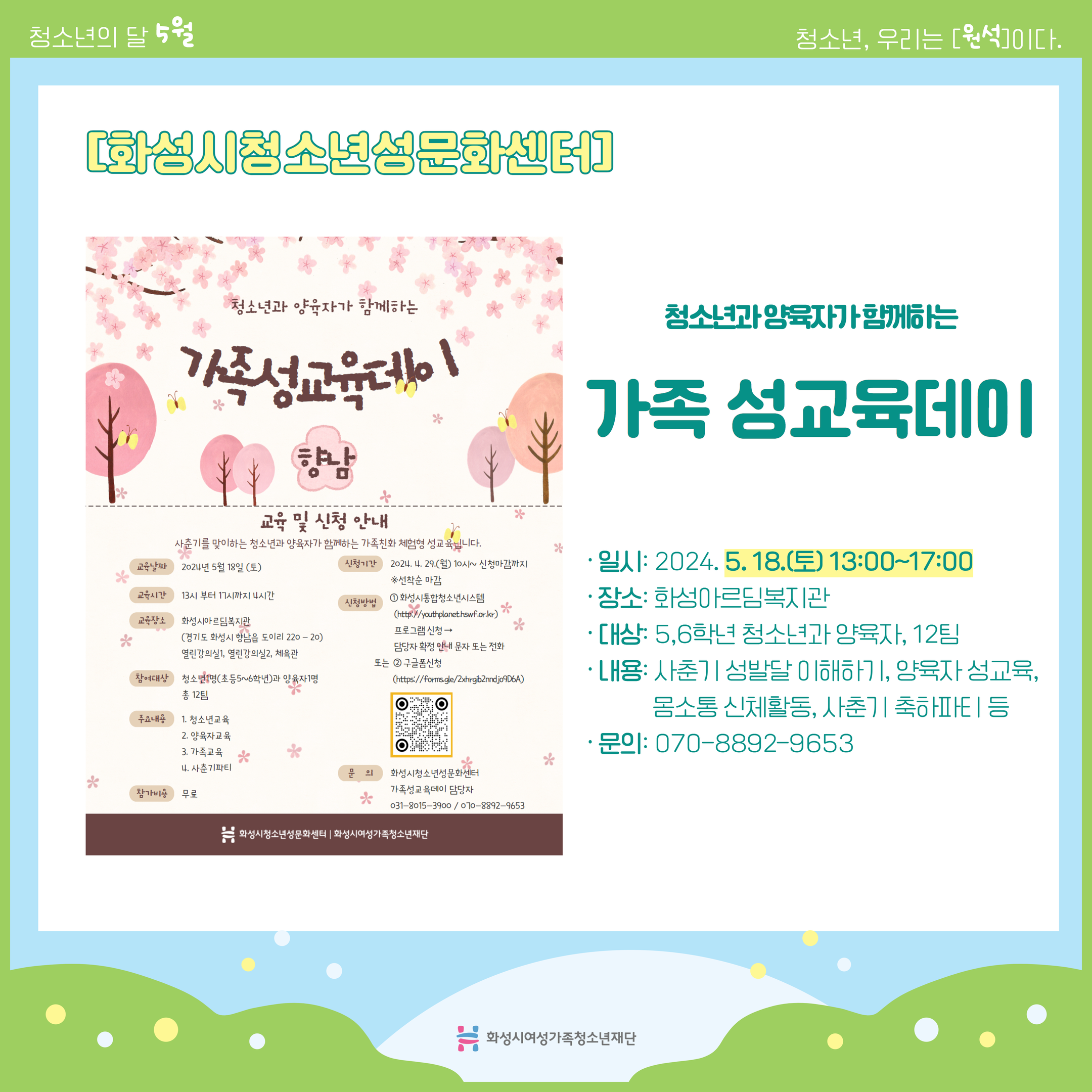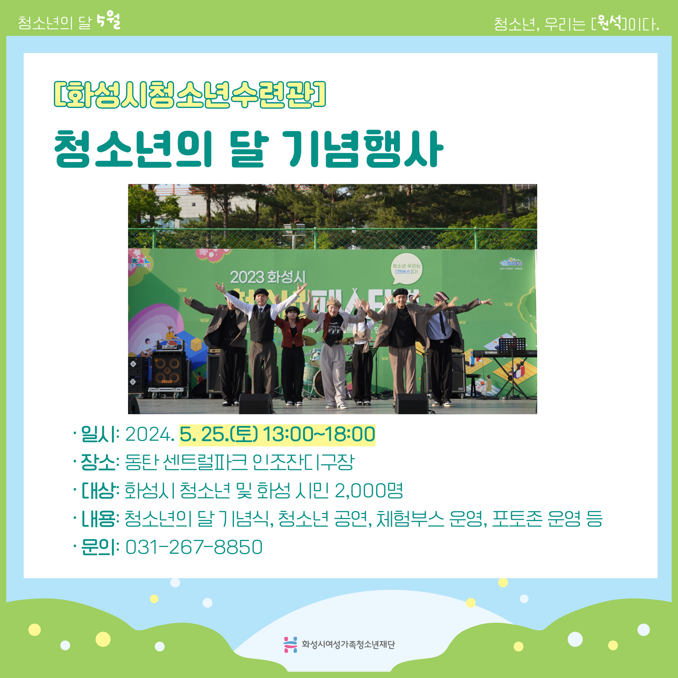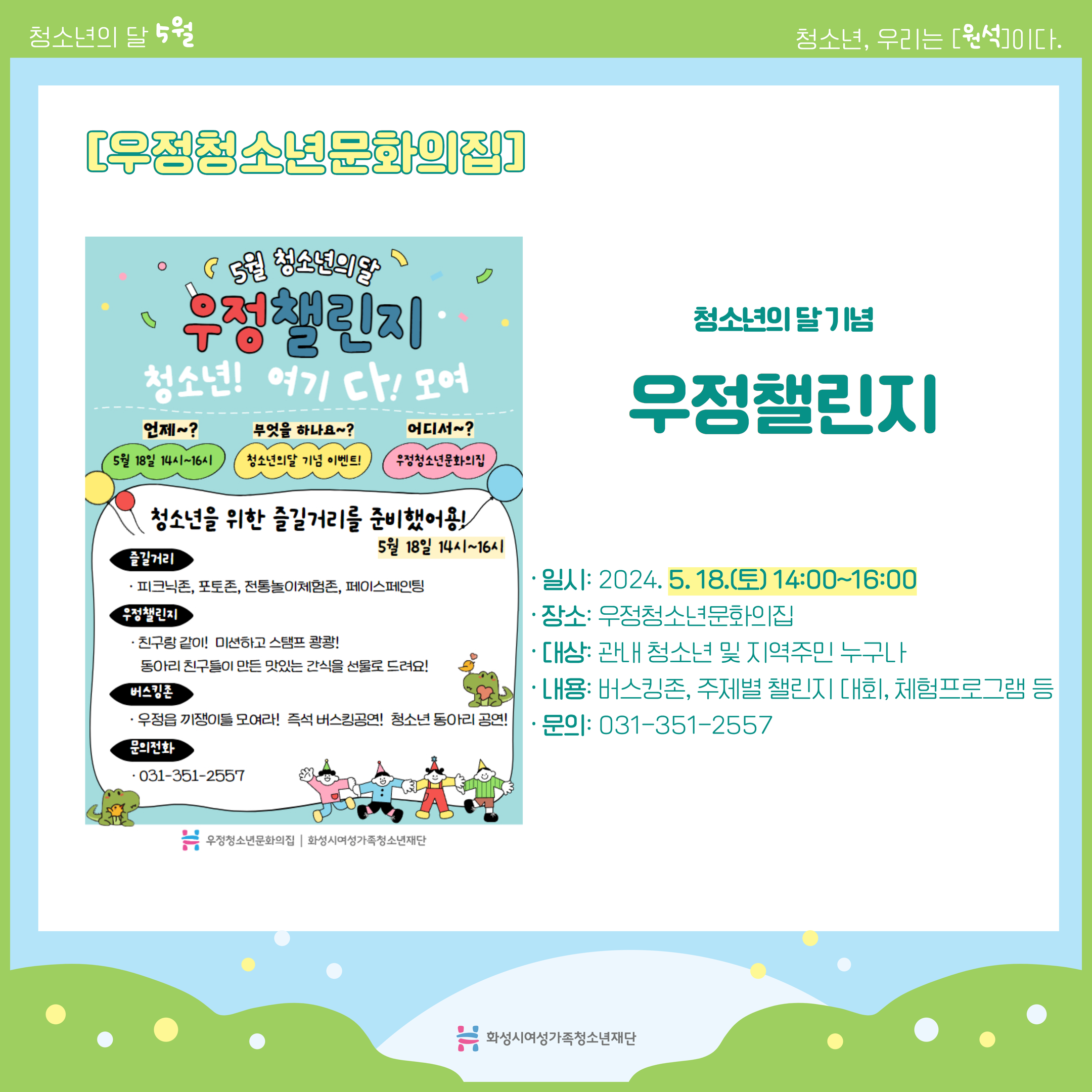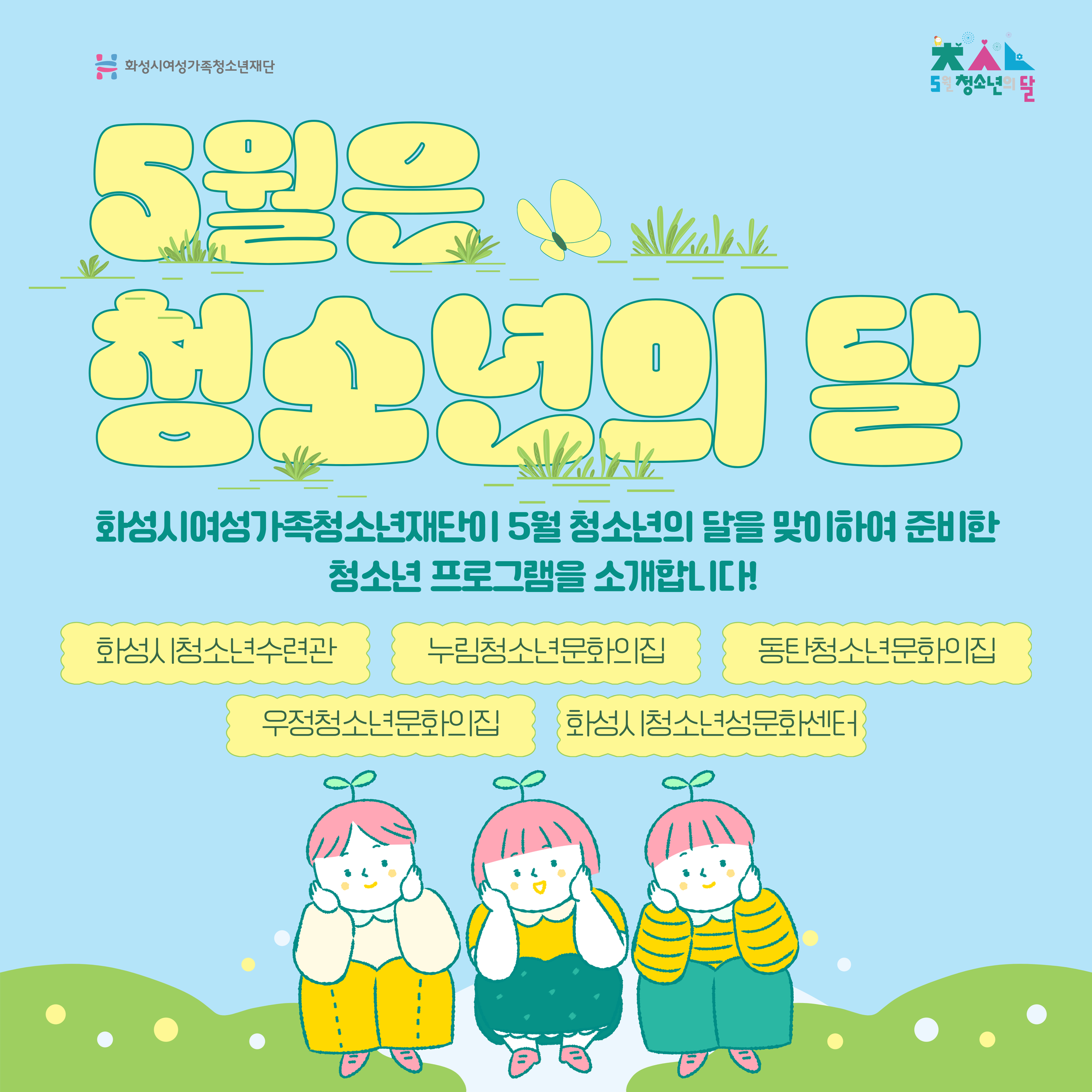 제목 청소년의 달 5월, 재단의 청소년활동을 소개합니다! 운영센터 화성시여성가족청소년재단 작성일 2024년 4월 29일 16시 24분 조회수 502 안녕하세요, 화성시여성가족청소년재단입니다.청소년의 달 5월을 맞이하여 준비한 청소년프로그램을 소개합니다!즐거운 축제가 많이 열리는 만큼 화성시 청소년과 지역주민들의 많은 참여 바랍니다♥ ? 목록보기