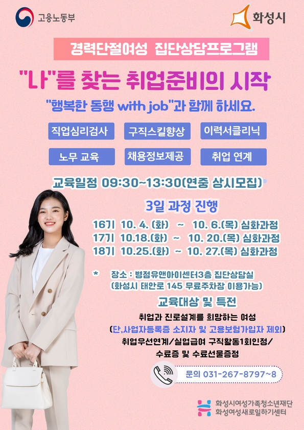 제목 2022년도 집단상담프로그램 참여자 모집 운영센터 화성여성새로일하기센터 작성일 2022년 1월 19일 14시 0분 조회수 2,628 첨부 파일 아이콘집단상담전단지 (6).jpg (433.18KB)다운로드 아이콘 목록보기