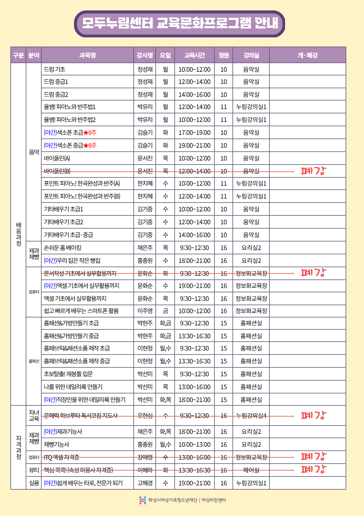 | 제목 | [화성시여성비전센터]2026년 2학기 모두누림센터{남양} 교육 프로그램 개강 및 폐강 강좌 공지 | ||