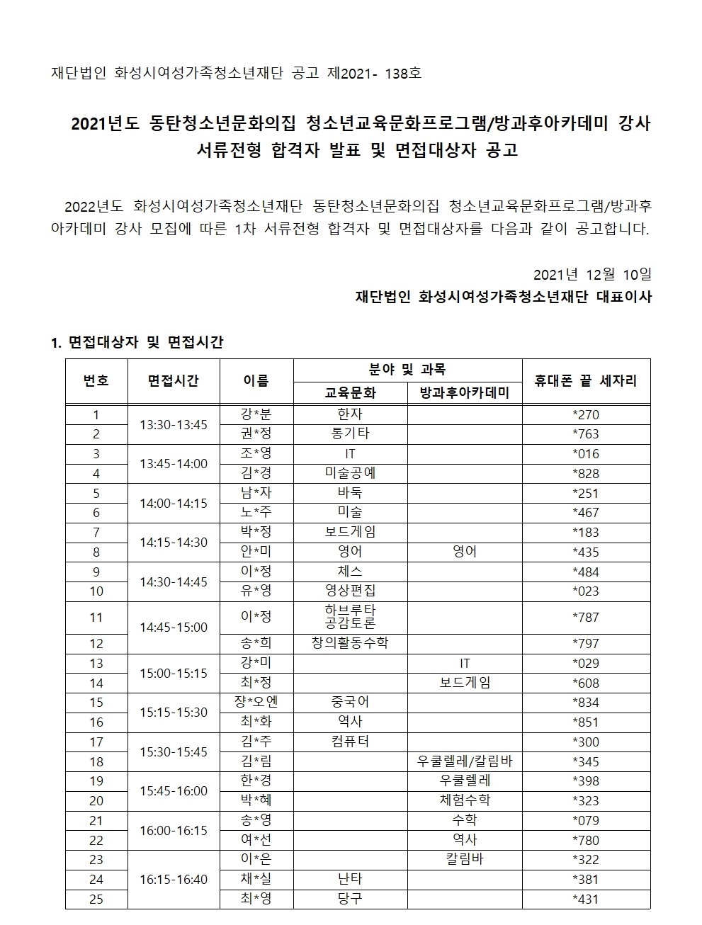 제목 2021년도 동탄청소년문화의집 청소년교육문화프로그램/방과후아카데미 강사 서류전형 합격자 발표 및 면접대상자 공고