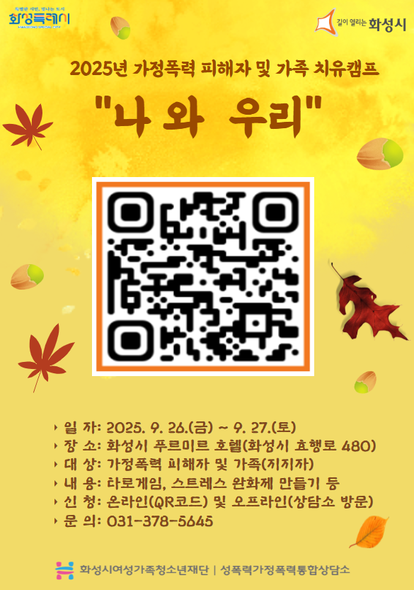 화성시성폭력가정폭력통합상담소에서 가정폭력 피해자 및 가족(지지자)을 대상으로 1박2일 캠프를 진행하게 되었습니다.