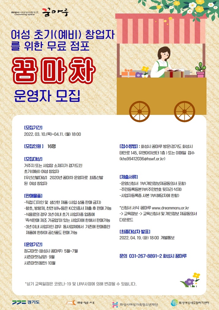 꿈마차 운영 장소는 유앤아이센터 1층 화성시 ‘꿈마루’ 앞이며, ‘꿈마차’ 운영자에 선발되면 올해 5월에서 7월까지 주 1회(6시간)씩 점포에 참여하여 판매할 수 있다. 판매 물품은 직접 디자인 및 생산한 제품만 가능하다(단, 향초 방향제, 천연비누 등은 KC 인증서 제출 후 판매 가능). 모집기간은 4월 11일(월)까지이며, 신청은 꿈마루 홈페이지 (www.dreammaru.or.kr)공지사항에서 서식을 다운받아 작성한 후 이메일(khs99412036@hswf.or.kr)로 제출하면 된다. 기타 세부 사항은 화성시 꿈마루 창업매니저 031-267-8891~2로 문의하면 된다.
