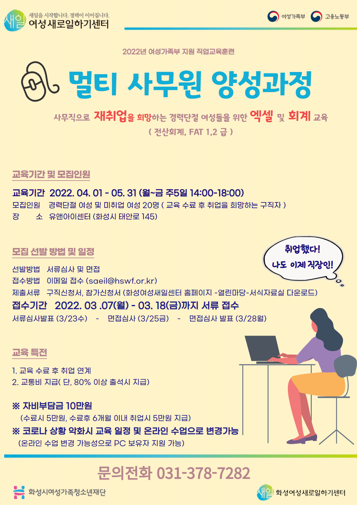 화성여성새로일하기센터, <2022 멀티 사무원 양성과정> 교육생 모집 - 경력단절 여성을 위한 여성가족부 지원 직업교육훈련 -