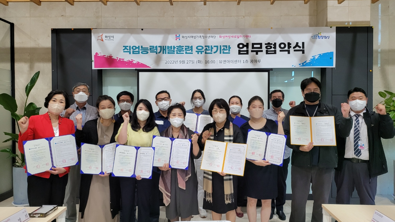 화성여성새로일하기센터, 유관기관과 업무협약식 진행 - 2022년 경력단절여성 취업지원 및 역량강화지원을 위한 업무협약식 개최 - (재)화성시여성가족청소년재단(대표이사 김경륜) 화성여성새로일하기센터는 9월 27일(화) 유앤아이센터에서 경력단절여성 취업지원 및 역량강화지원을 위해 유관기관과 업무협약식을 진행했다. 화성여성새로일하기센터와 협약기관은 산업현장 요구를 반영한 양질의 직업교육훈련과정 개발, 구직자 취업지원서비스 관련 일자리 협력망 구축, 직업교육훈련 여성 수료생의 취업지원, 구인·구직 알선연계와 관련하여 의견을 나누었다. 이번 업무협약식에 참석한 총 11개 기관은 고용노동부, 보건복지부, 교육부, 지차제 인?지정 등록 시설로 구직자를 위한 직업능력개발훈련 전문기관으로 운영되고 있다. 참석 명단은 ▲경기IT프로그래밍직업교육학원(대표 김상모), ▲남양노아간호학원(원장 배석란), ▲남양노아요양보호사교육원(대표 이영민), ▲병점길요양보호사교육원(원장 구묘신) ▲세민직업전문학교(학교장 오세억), ▲수원탑간호학원(원장 조영춘), ▲수원탑요양보호사교육원(원장 정순옥), ▲수정인테리어기술전문학원(원장 이정란), ▲오산호텔요리제과제빵학원(원장 서순영), ▲유진IT컴퓨터교육원(원장 조장현), ▲전통외식조리직업전문학교(학교장 홍명희)이다. 경기IT프로그래밍교육학원(대표자 김상모)은 “화성시는 첨단산업도시로 탈바꿈하고 있고, 특히 반도체 산업현장에서 필요로 하는 전문 인력 수요가 많아 전문 인력 양성이 시급하다. 화성여성새로일하기센터와 협업을 통해 과정개발 등 협업의견을 공유하며 전문 인력 양성에 최선을 다하겠다”고 전했다. 화성여성새로일하기센터 관계자는 “공공훈련기관으로 책임을 다하고 민간직업훈련기관을 계속 발굴해 협업할 수 있도록 네트워크 구축에 노력하고, 여성 구직자를 위한 취업지원서비스 질 제고, 직업 훈련품질 관리에도 최선을 다하겠다”고 다짐을 전했다. 관련 문의사항은 화성여성새로일하기센터(031-267-8794)로 문의할 수 있다.