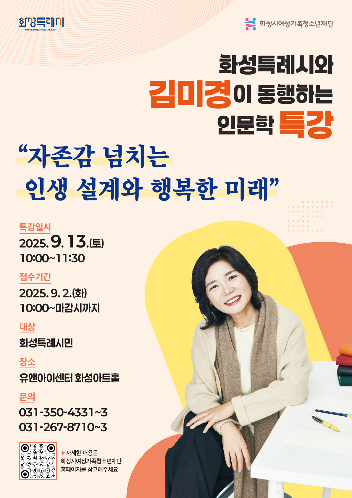 (재)화성시여성가족청소년재단(대표이사 박윤희) 화성시여성비전센터는 화성특례시와 김미경 강사가 동행하는 인문학 특강 The 화. 동. 인 참여자를 모집한다고 밝혔다. 이번 인문학 특강은 여성·가족·청소년이 행복한 삶을 누릴 수 있도록 양성평등과 행복을 실천하는 가족문화 확산을 목표로 기획되었으며, 시민들이 일과 삶의 균형을 추구하고 사회 변화에 능동적으로 대응하며 자존감과 삶의 질을 높일 수 있도록 돕는 소통과 협력의 장으로 마련됐다. 참가 신청은 9월 2일(화) 10시부터 화성시여성가족청소년재단 홈페이지를 통해 선착순 500명을 모집하며, 특강은 9월 13일(토) 오전 10시 유앤아이센터 화성아트홀에서 열린다. 화성시여성비전센터 관계자는 “이번 특강을 통해 화성특례시민들이 나답게, 당당하게, 그리고 행복하게 살아가는 길을 찾을 수 있기를 기대한다”며, “이를 통해 시민들이 삶의 질 향상과 행복지수 향상에도 긍정적인 효과가 있을 것으로 본다”라고 말했다. 자세한 내용은 화성시여성가족청소년재단(https://www.hswf.or.kr/fmcs/1)에서 확인 가능하며, 문의는 여성가족사업팀(031-350-4331~3)으로 문의하면 된다.