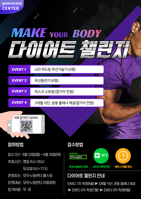 모두누림센터 헬스장 <2022 다이어트 챌린지> 참가자 모집 (재)화성시여성가족청소년재단(대표이사 김경륜) 모두누림센터는 2022년 5월 23일(월)부터 2022년 6월 30일(목)까지 <2022 다이어트 챌린지> 참가자를 공개 모집한다. 이번 챌린지는 모두누림센터 헬스장에서 헬스케어 서비스와 연계하여 새롭게 진행하는 이벤트로 ▲1차 체성분 측정(6월)을 통한 체지방률 기준 설정 ▲2차 체성분 측정(7월)을 통한 중간 피드백 ▲3차 체성분 측정(8월)을 통한 최종 체지방률 측정으로 구성되어 총 3회에 걸쳐 체성분 측정 및 상담을 제공한다. 챌린지 참여를 통해 1차(초기) 체지방률과 3차(최종) 체지방률의 감소량이 가장 큰 상위 10명에게 상품을 증정하며 참가자 전원에게 3개월 동안의 식단, 운동 플래너와 마스크 스트랩을 제공한다. 헬스장 담당자는 "여름이 다가오면서 모두누림센터 헬스 이용회원들의 체중관리 욕구가 증가함에 따라 고객의 니즈를 반영한 이벤트를 준비하였다. 기존에 운영하고 있던 헬스케어 서비스와 연계하여 진행함으로써 혼자서 진행하기 벅찼던 체중관리에 지속적인 동기부여와 자극을 드려 다이어트 성공에 보탬이 되고자 하니, 회원 분들의 많은 참여를 부탁드린다."라고 말하며, “앞으로도 회원들의 건강관리와 운동지속을 위해 다양한 스포츠 프로그램을 진행하겠다.”고 전했다.”라고 전했다. 챌린지 참가 접수는 화성시여성가족청소년재단 모두누림센터 이용회원이면 누구나 참여할 수 있으며, 네이버에 ‘모두누림센터 헬스장’ 검색 후 네이버 예약 또는 홍보지의 QR코드로 신청할 수 있다. 6월 30일(목)까지 접수 가능하며, 보다 자세한 사항은 모두누림센터 홈페이지 공지사항에서 확인이 가능하다. 기타 사항은 모두누림센터 헬스장 031-350-4374로 문의할 수 있다. |
