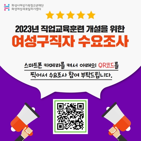 화성여성새로일하기센터, 2023년 직업교육훈련 개설을 위한 수요조사 실시 - 직업교육훈련 수요조사 10월 14일까지 실시 - (재)화성시여성가족청소년재단(대표이사 김경륜) 화성여성새로일하기센터(이하 화성새일센터)는 2023년 직업교육훈련 개설을 위한 수요조사를 내달 10월 14일까지 실시한다고 밝혔다. 화성새일센터는 이번 수요조사를 통해 화성시 거주 여성 시민들의 구직·직업교육 수요를 파악하여 지역사회 맞춤형 2023년 직업교육훈련 과정을 개설하는데 활용할 예정이다. 설문 대상은 화성시에 거주하는 취업을 희망하는 여성 500~1000명으로, 온라인 설문지 폼을 통하여 참여 가능하다. 설문 문항은 수요가 있는 연령과 지역 등을 파악할 수 있도록 참여자 연령대와 거주 읍면동 등 기본 문항과 취업희망 직종 및 희망 교육장소 등의 문항으로 구성되어 있다. 화성새일센터 관계자는 “금년 2022년 직업교육훈련 개설 시에 2021년 수요조사 결과를 반영하였고, 내년 직업교육훈련 개설에도 시민들의 의견을 반영하고 양질의 교육을 제공할 수 있도록 수요조사에 많은 참여 바란다”고 전했다. 2023년 직업교육훈련 계획은 이번 수요조사 결과 등을 반영하여 선정하며, 2023년 초에 홈페이지 등을 통해 공지할 예정이다. 자세한 사항은 화성새일센터(031-267- 8792~8)로 문의하면 된다. * 2023년 직업교육훈련 개설을 위한 수요조사 참여 링크(https://naver.me/5thkoLlm)