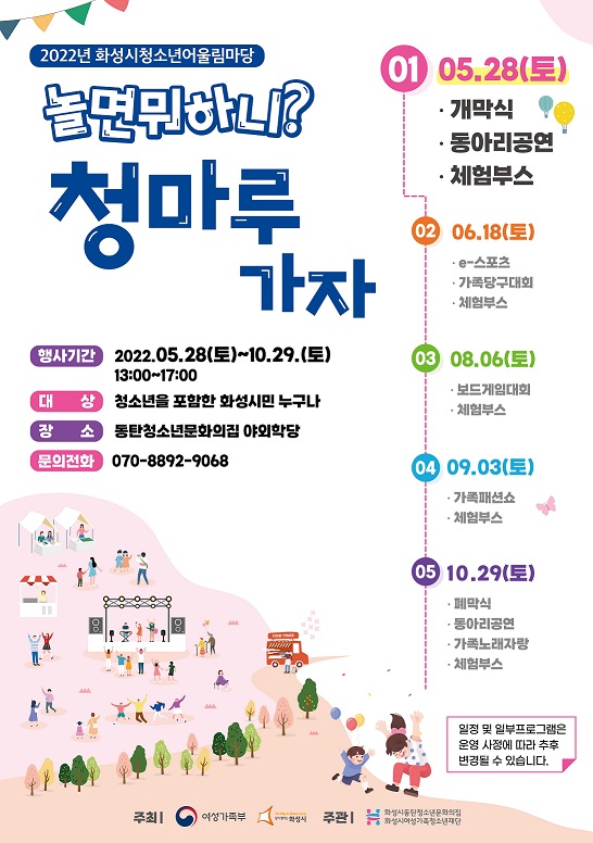 (재)화성시여성가족청소년재단(대표이사 김경륜) 동탄청소년문화의집에서는 청소년들의 다양한 끼와 재능을 엿볼 수 있는 <2022년 화성시청소년어울림마당> 청마루를 대면으로 개최한다고 밝혔다. 여성가족부와 화성시가 주최하고 동탄청소년문화의집이 주관하는 화성시청소년어울림마당은 총 5회차로 운영되며, 5월 28일(토)에 개막식을 시작으로 동아리공연 및 다양한 체험부스가 동탄청소년문화의집 야외학당에서 진행될 예정이다. 청소년어울림마당은 청소년들이 만들어가는 행사로서, 청소년동아리들이 직접 공연을 진행하고 체험부스를 운영한다. 이를 통해 청소년들의 소속감 및 유대감이 증진되어 지역사회에 긍정적인 영향을 끼칠 것으로 보인다. 화성시 청소년 및 지역주민 누구나 참여할 수 있으며, e-스포츠, 가족당구대회, 보드게임대회, 가족패션쇼, 가족노래자랑 등 회차별 다양한 프로그램으로 구성되어 있다. 보다 많은 청소년들의 문화감수성 함양과 건전한 여가문화 확산을 위하여 총 5회차(5/28, 6/18, 8/6, 9/3, 10/29)로 운영될 예정이다. 자세한 사항은 동탄청소년문화의집(070-8892-9068)으로 문의하면 된다.