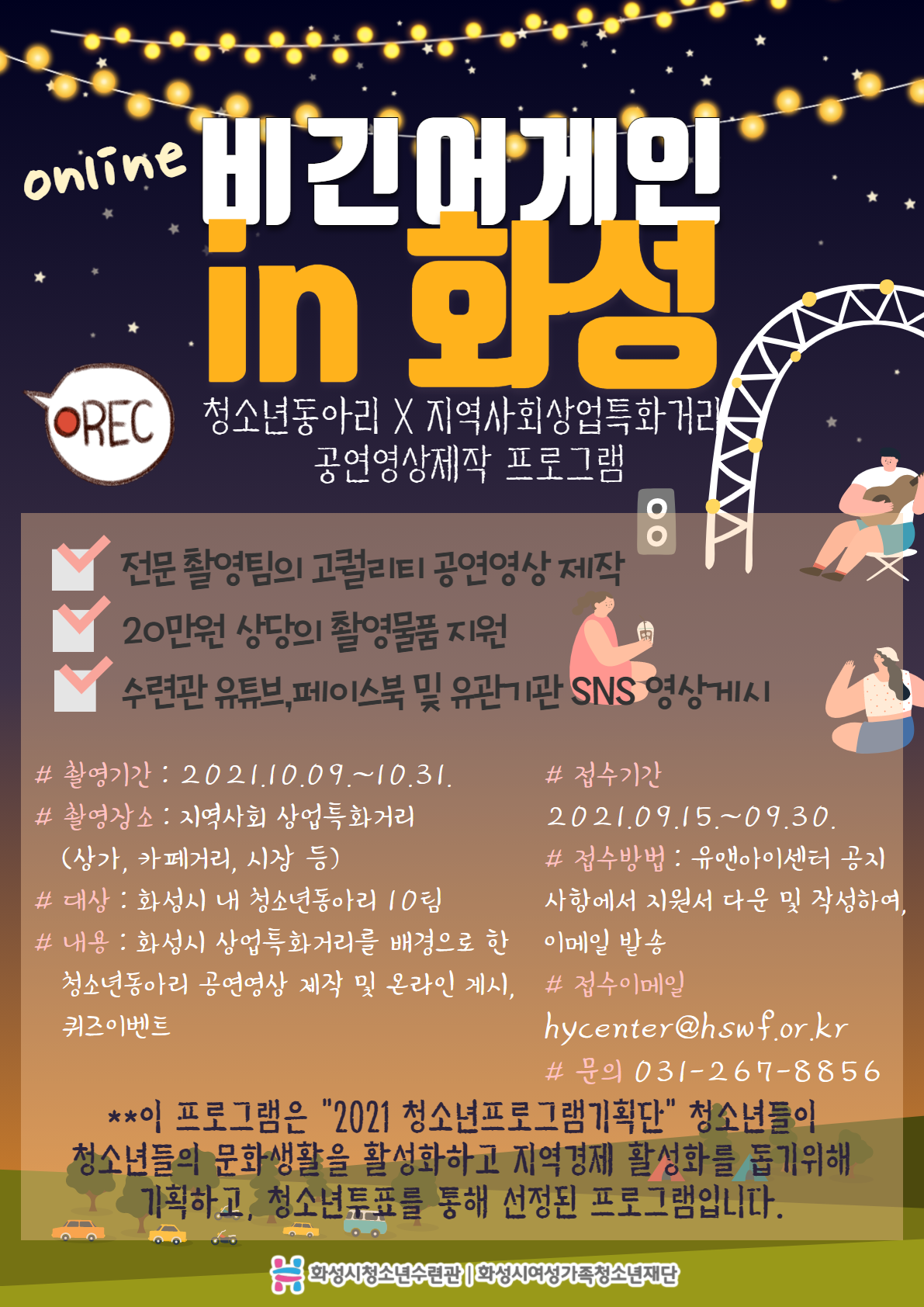 화성시청소년수련관(화성시여성가족청소년재단 운영)은 청소년프로그램 참여예산제에서 청소년이 직접 기획한 “비긴어게인 in 화성”에 참여할 동아리를 모집한다. 청소년동아리 10팀을 모집하여 전문 영상제작팀과 함께 지역사회 상업특화거리에서 공연영상을 촬영하고 제작하는 사업이다. 제작된 영상은 수련관의 각종 SNS에 게시되어, 코로나19 사회적거리두기로 인해 제한된 청소년의 문화활동을 온라인으로 대체하여 운영하게 된다. 모집 대상은 화성시의 청소년동아리 10팀으로 9월 15일부터 9월 30일까지 이메일 접수를 통해 이루어지며 10월 중 영상촬영이 진행된다. 이번 사업은 지난 6월 ‘청소년프로그램 기획단’에서 9~24세의 청소년 30여명이 모여 지역사회 청소년이 필요한 사업을 기획하였다. 총 4개의 프로그램 중 청소년투표를 통해 진로와 문화 분야에서 2개의 프로그램이 선발되었다. 그 중 청소년동아리 공연 및 지역사회 상권 활성화를 위한 ‘비긴어게인 in 화성’ 프로그램을 운영한다. 자세한 사항은 유앤아이센터 홈페이지(https://www.hswf.or.kr/unicenter)를 참고하거나 전화(031-267-8856)로 문의하면 된다.