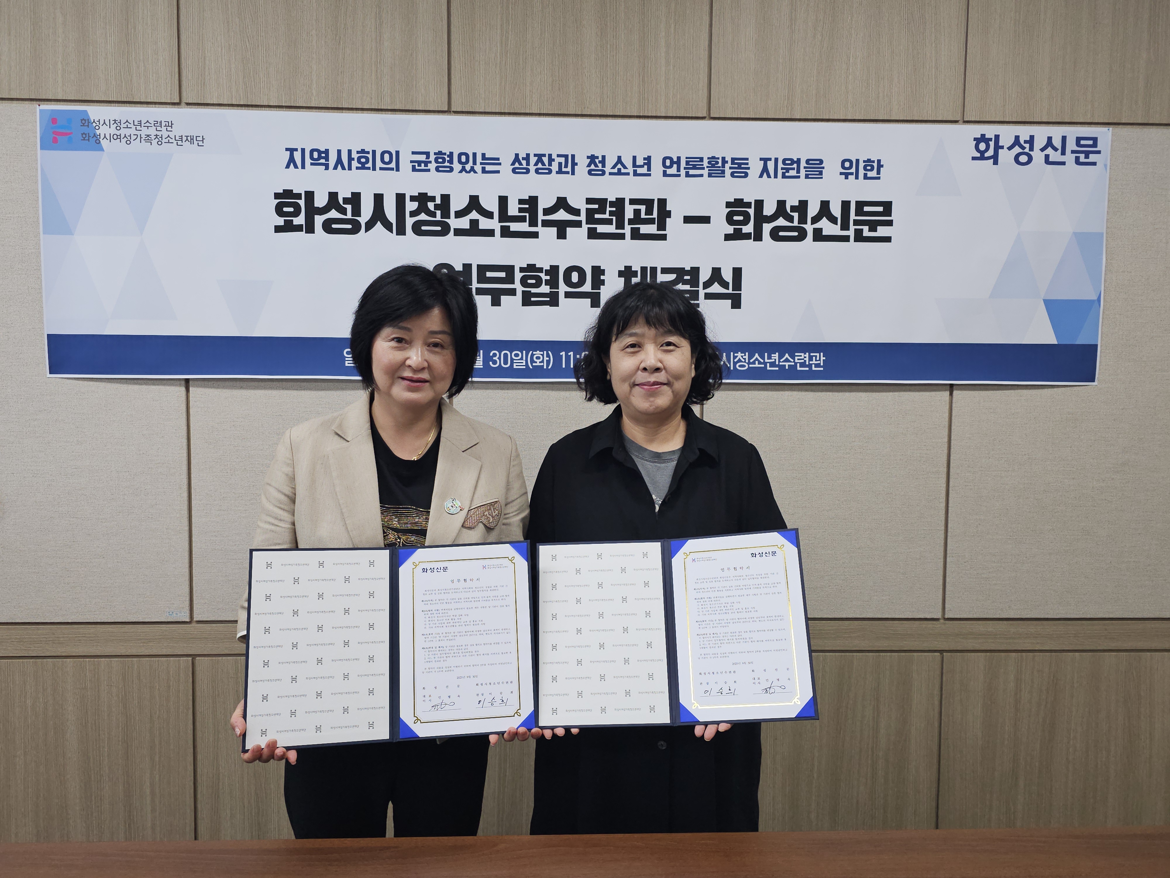 (재)화성시여성가족청소년재단 화성시청소년수련관(관장 이승희)은 9월 30일 화성신문(대표 민병옥)과 지역사회 발전과 청소년의 성장을 위해 상호 협력하는 내용의 업무협약을 체결하였다. 이번 협약을 통해 양 기관은 ▲화성시 청소년기자단 역량 강화 ▲청소년 언론 활동 지원 ▲양 기관 사업에 대한 교류 및 홍보 지원 ▲지역사회 청소년활동 관련 협력 등을 함께 추진하기로 했다. 이 자리에서 화성시청소년수련관 이승희 관장은 “이번 협약을 통해 양 기관이 긴밀히 협력하여 청소년들이 언론 활동을 통해 자신의 목소리를 내고, 지역사회의 건강한 구성원으로 성장할 수 있도록 적극 지원하겠다”고 말했다.