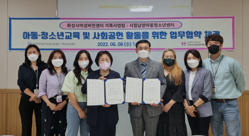 화성시여성비전센터 가족사업팀-시립남양아동청소년센터 업무협약(MOU) 체결 - 화성시여성비전센터 가족사업팀 시립남양아동청소년센터 아동·청소년의 교육 및 사회공헌활동을 위한 업무협약 - 화성시여성가족청소년재단 가족사업팀(화성시여성비전센터)과 시립남양아동청소년센터는 6월 8일, 모두누림센터에서 아동·청소년의 교육 및 사회공헌활동을 위한 업무협약(MOU)을 체결하였다. 양 기관은 이번 협약 체결을 통해 △아동·청소년 관련 교류·협력사업 행사 정보 및 공동협조 활동 △여성비전센터를 통해 양성된 강사를 통한 교육활동 △시설, 인적, 물적 자원 확보 등 교육인프라 공유 등 아동·청소년의 교육 및 사회공헌활동을 활성화하여 관내 아동·청소년들의 건강한 성장을 도모 할 수 있도록 상호협력하기로 했다. 화성시여성비전센터 가족사업팀에서는 시립남양아동청소년센터를 이용하는 아동·청소년들에게 사회공헌활동의 일환으로 6월 8일부터 매월 강사 및 학습동아리 회원들의 재능기부를 통한 제과·제빵을 전달할 예정이며, 방학기간을 활용하여 양성평등 교육 프로그램을 지원할 예정이다. 화성시여성비전센터 관계자는 “이번 사회공헌활동을 통해 화성시 관내 아동·청소년들에게 나눔문화 확산뿐만아니라 양 기관의 교류와 협력으로 청소년 문화·복지 발전에 기여할 수 있기를 바란다.”라고 밝혔다. 기타 자세한 사항은 가족사업팀 031-350-4331로 문의할 수 있다.