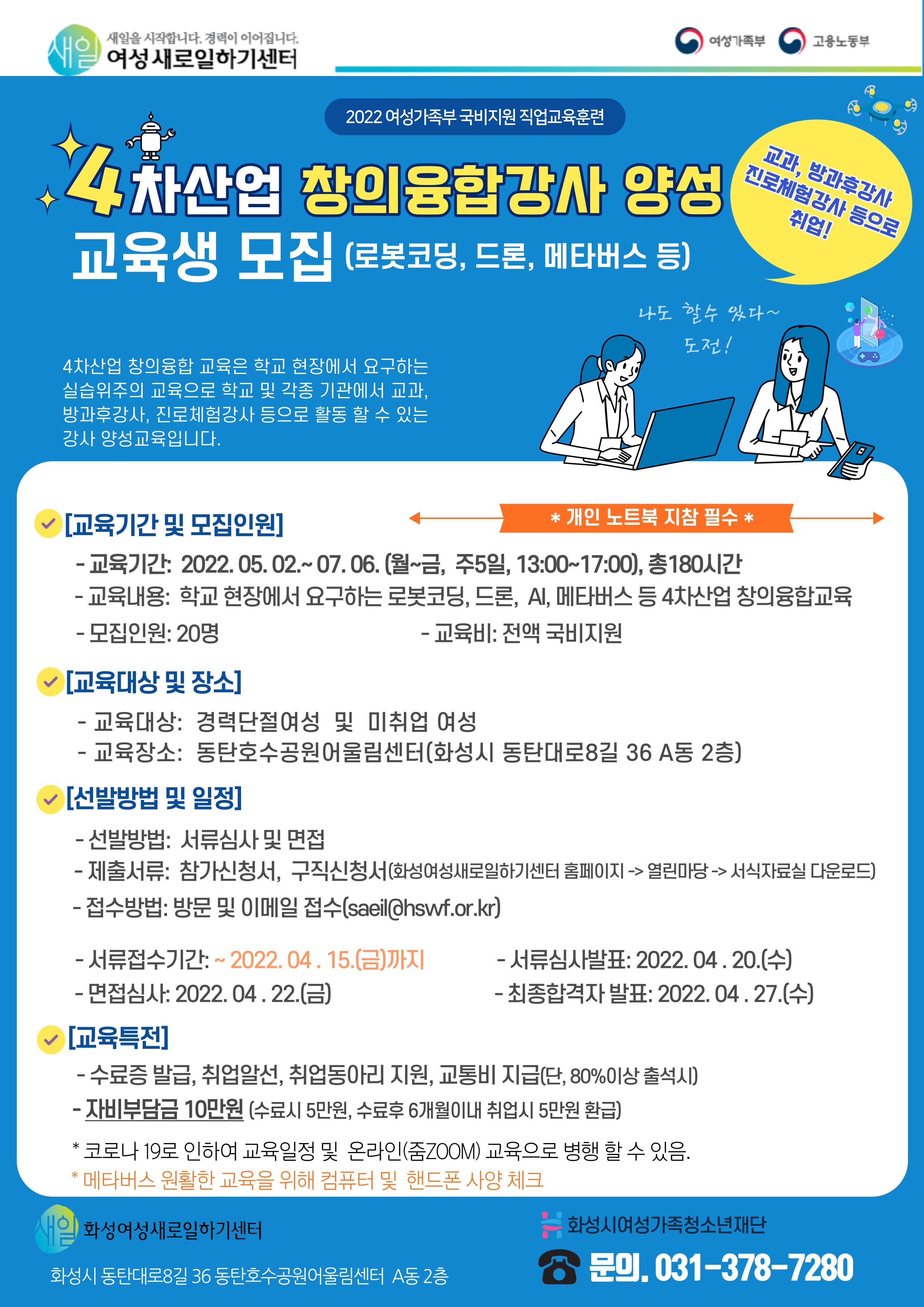 화성시여성가족청소년재단, <4차산업 창의융합강사 양성과정 교육생 모집> - 경력단절여성을 대상으로 학교 현장에서 요구하는 로봇코딩, 드론, AI, 메타버스 등 4차산업 창의융합 교육과정 운영 - ? (재)화성시여성가족청소년재단(대표이사 김경륜) 화성여성새로일하기센터는 여성가족부가 지원하는 직업훈련교육의 일환인 <4차산업 창의융합강사 양성과정> 교육생을 2022년 4월 15일(금)까지 모집한다. <4차산업 창의융합강사 양성과정>은 학교 현장에서 요구하는 로봇코딩, 드론, AI, 메타버스 등에 대한 실습 위주의 교육 프로그램으로, 학교 및 각종 기관에서 교과, 방과 후 강사, 진로체험강사 등으로 재취업할 수 있도록 지원하는 과정이다. 경력단절 및 미취업 여성을 대상으로 하며, 동탄호수공원어울림센터에서 진행될 예정이다. 교육기간은 2022년 5월 2일(월)부터 7월 6일(수), 주 5회, 13:00~17:00(4시간)으로 총 180시간 동안 이루어진다. 신청서는 https://hswf.or.kr/womanjob 홈페이지 공지사항에서 다운받아 작성하여, 4월 15일(금)까지 이메일 (saeil@hswf.or.kr)로 제출하면 된다. 보다 상세한 사항은 홈페이지를 참고하거나, 화성여성새로일하기센터 교육 담당자(031-378-7280)에게 문의하면 된다.