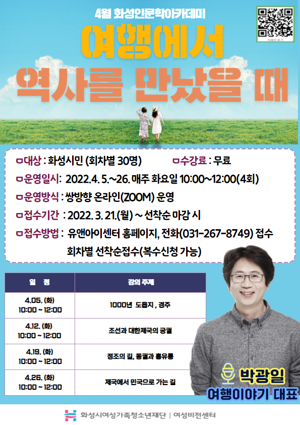 ? (재)화성시여성가족청소년재단(대표이사 김경륜) 화성시여성비전센터는 2022년 3월 21일(월)부터 선착순으로 4월 화성인문학아카데미 수강생을 모집한다. 이번 화성인문학아카데미는 ‘여행에서 역사를 만났을 때’라는 주제로 4월 5일부터 4월 26일까지 매주 화요일, 10:00~12:00(총 4회차, 각 2시간)동안 쌍방향 온라인 줌(zoom)으로 진행된다. 3월 21일 월요일부터 선착순으로 회차별 30명씩 총 120명을 모집하며, 화성시 관내의 인문학에 관심 있는 성인이라면 누구나 들을 수 있다. 『교과서 밖으로 나온 한국사』, 『우리 아이 첫 경주여행』의 저자이자 역사문화 답사 전문가인 ㈜여행이야기 박광일대표가 여행지에서 만나는 생생한 역사 이야기를 들려줄 예정이다. 화성시여성비전센터 관계자는 “이번 강의를 통해 당연하게 생각했던 우리 역사와 문화에 대해 새롭게 생각할 수 있는 계기를 마련하여 관내 시민들이 역사를 어려운 학문이 아닌, 여행에서 만날 수 있는 익숙한 삶의 한 부분으로 인식하게 되는 기회가 되길 바란다.”라고 전했다. 기타 상세사항은 홈페이지(https://www.hswf.or.kr/unicenter)를 참고하거나 전화(031-267-8749)로 문의하면 된다.