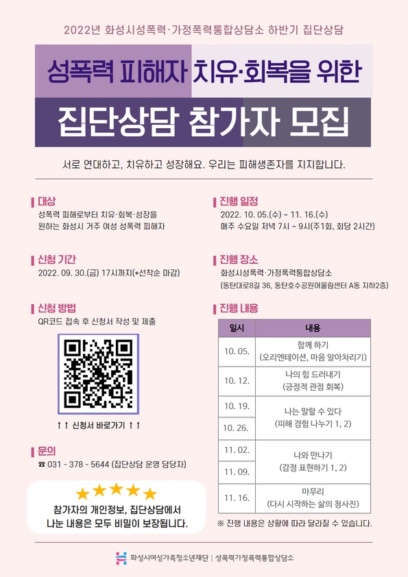 - 대상 : 화성시 거주 여성 성폭력 피해자 - 기간 : 10. 5.(수) ~ 11. 16.(수) / 매주 수요일 저녁 7시 ~ 9시(2시간씩 총7회) - 장소 : 화성시성폭력·가정폭력통합상담소 집단교육장 -내용 : 성폭력 피해로부터 심리/정서적 치유·회복, 안전한 상황 속 피해 경험 나누기 - 신청방법 : 포스터 QR 코드 인식 후 신청서 링크 접속 → 내용 작성 후 '제출하기' 클릭