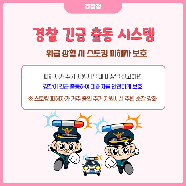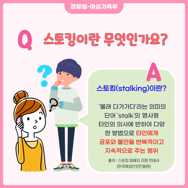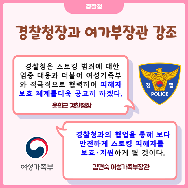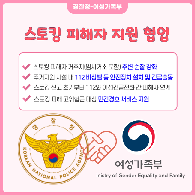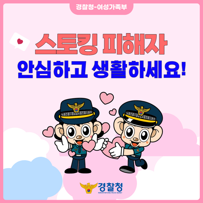 자료마당 상세 경찰청·여가부, 스토킹 피해자를 더욱 안전하게!! 등록일 2024.01.10 조회수 397 - 출처: 경찰청 첨부파일 파일 아이콘001.png (201.08KB)다운로드 아이콘 파일 아이콘002.png (190.96KB)다운로드 아이콘 파일 아이콘003.png (212.31KB)다운로드 아이콘 파일 아이콘004.png (176.61KB)다운로드 아이콘 파일 아이콘005.png (112.71KB)다운로드 아이콘 파일 아이콘006.png (205.85KB)다운로드 아이콘 파일 아이콘007.png (178.36KB)다운로드 아이콘 파일 아이콘008.png (192.86KB)다운로드 아이콘 목록보기