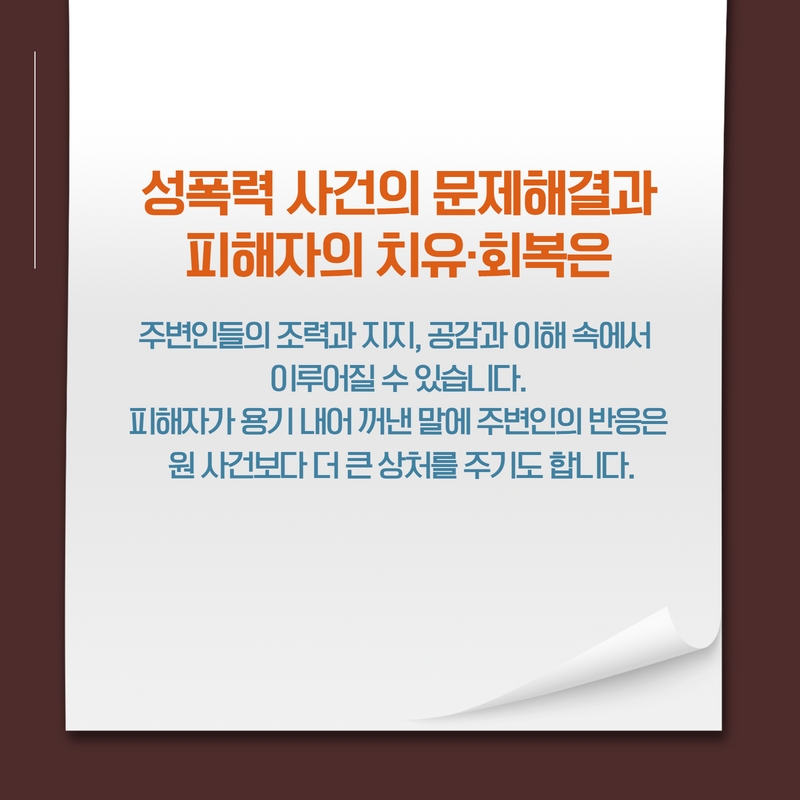 자료마당 상세 [카드뉴스] 성폭력, Q&A (2) 지인이 피해자라면 어떻게 해야하나요? 등록일 2022.08.05 조회수 747 첨부파일 파일 아이콘카드뉴스1.jpg (90.79KB)다운로드 아이콘 파일 아이콘카드뉴스2.jpg (203.03KB)다운로드 아이콘 파일 아이콘카드뉴스3.jpg (210.78KB)다운로드 아이콘 파일 아이콘카드뉴스4.jpg (151.72KB)다운로드 아이콘 파일 아이콘카드뉴스5.jpg (198.02KB)다운로드 아이콘 파일 아이콘카드뉴스6.jpg (218.56KB)다운로드 아이콘 파일 아이콘카드뉴스7.jpg (174.42KB)다운로드 아이콘 목록보기