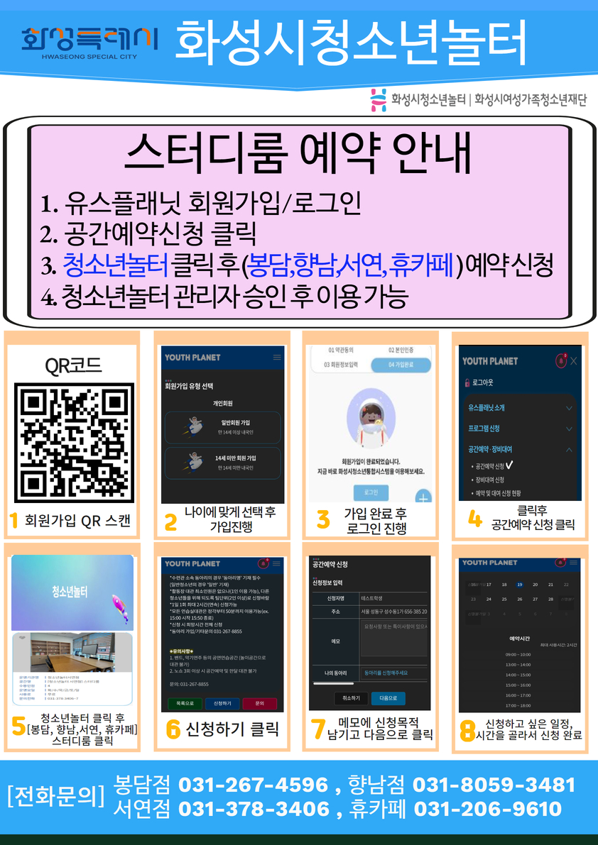 화성특례시 화성시청소년놀터 스터디룸 대관 예약 안내 1. 유스플래닛 회원가입/ 로그인 2. 공간예약신청 클릭 3. 청소년놀터 클릭 후(봉담,향남,서연,휴카페) 예약 신청 4. 청소년놀터 관리자 승인 후 이용 가능