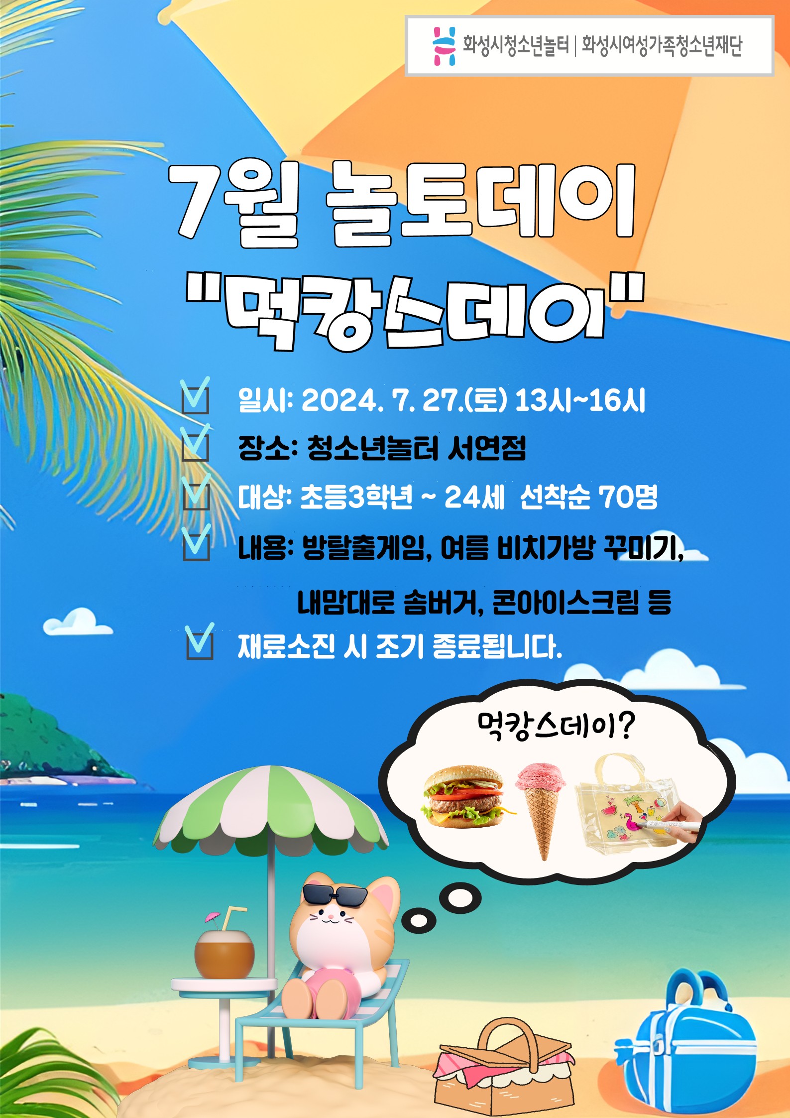 | 제목 | [청소년놀터 서연점] 7월 놀토데이 "먹캉스데이" 참가자 모집 안내 | ||