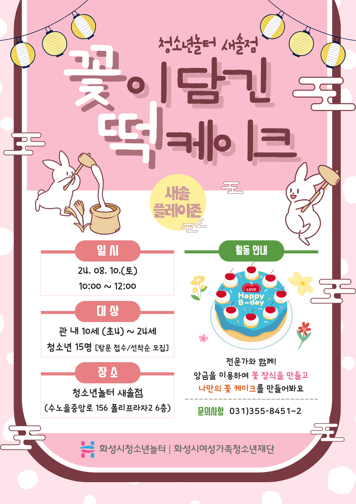 | 제목 | [청소년놀터 새솔점] 8월 새솔 플레이존 "꽃이 담긴 떡케이크" 참가자 모집 안내 | ||