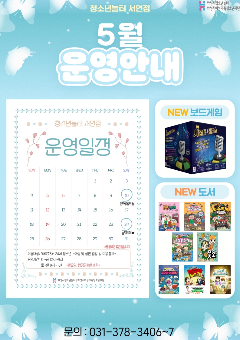 | 제목 | [청소년놀터 서연점] 5월 휴관 및 운영시간 안내 | ||
