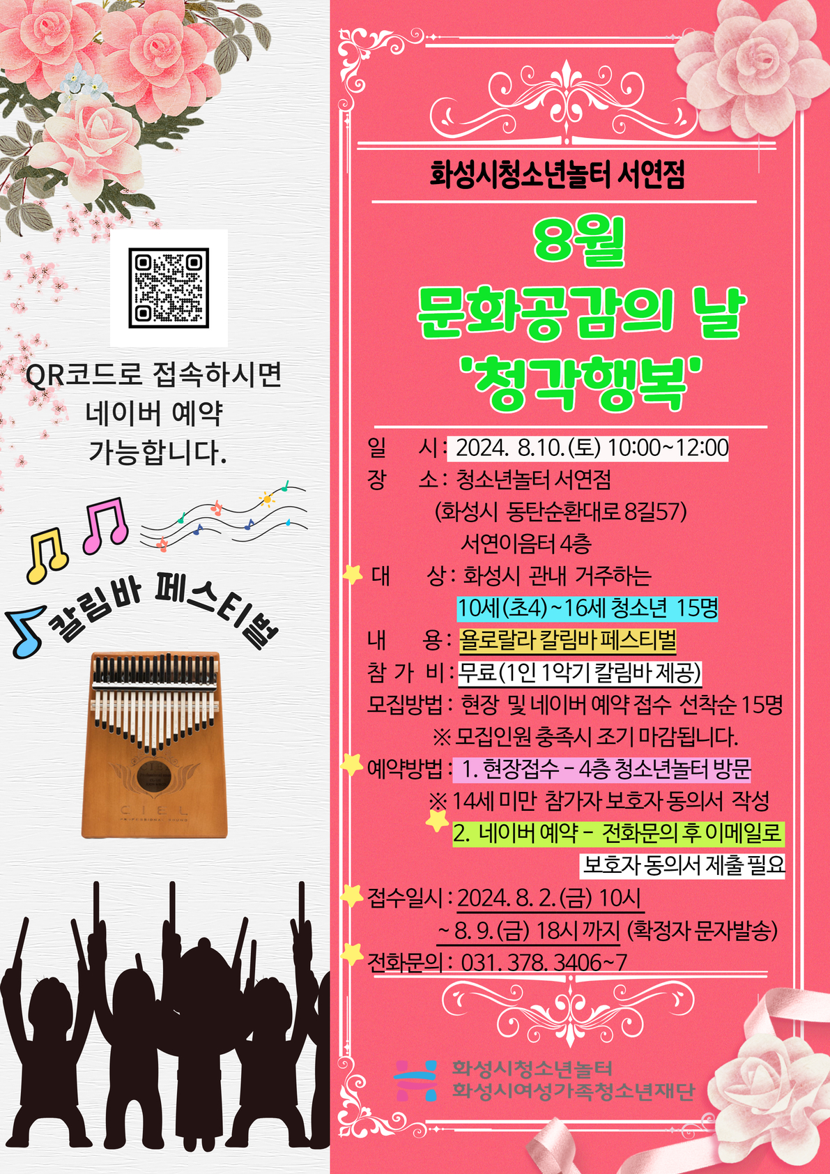 화성시청소년놀터 서연점 8월 문화공감의 날 일 시: 2024. 8. 10.(토) 10:00~12:00 장 소: 화성시청소년놀터 서연점 대 상: 화성시 관내 10세(초4)~16세 청소년 15명 내 용: 욜로랄라 칼림바 페스티벌 참 가 비: 무료 모집방법: 현장 및 네이버 예약 접수 15명 예약방법: 현장 - 4층 청소년놀터 안내데스크 네이버 예약 -> 전화문의 -> [보호자동의서] 작성 -> 이메일(cosmos@hswf.or.kr) ※14세 미만 참가자 보호자 동의서 제출 필수 접수일시: 2024. 8. 2.(금) 10시~ 8. 9.(금) 18시까지 모집인원 충족 시 조기 마감됩니다.