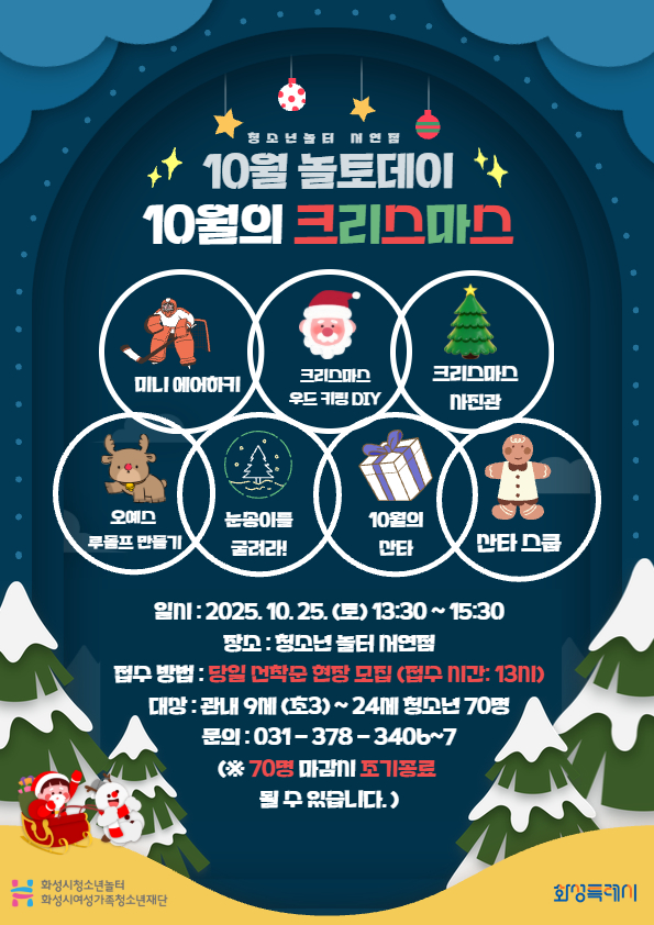 안녕하세요~! 청소년놀터 서연점입니다! 행복한 한가위 잘 보내셨나요? 이번 10월에는 청소년의 행복한 토요일을 위한 행사 놀토데이를 올해 마지막으로 진행합니다! (내년에도 다시 찾아올 예정이니 아쉬워도 잠시만 기다려주세요 :D) 어느덧 무더위는 지나가고, 선선한 바람 속에서 연말의 설렘이 살짝 느껴지는 계절이 되었습니다. 그래서 이번 달은 조금 특별하게, "10월의 크리스마스"라는 주제로 프로그램을 준비했습니다!