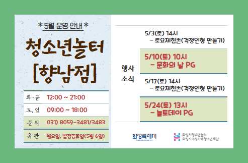 | 제목 | [청소년놀터 향남점] 5월 이용안내 | ||