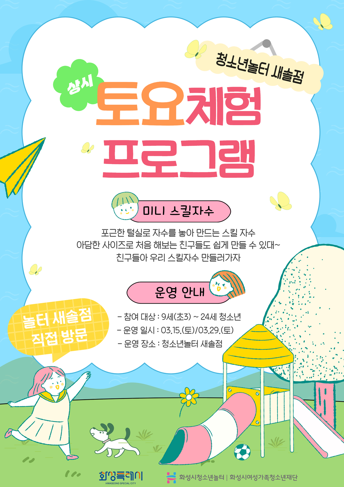 3월 15일 토요일, 3월 29일 토요일에 토요체험 프로그램을 진행합니다. 미니 스킬자수를 처음 해보는 친구들도 쉽게 완성할 수 있으니 많은 관심과 참여 부탁드립니다