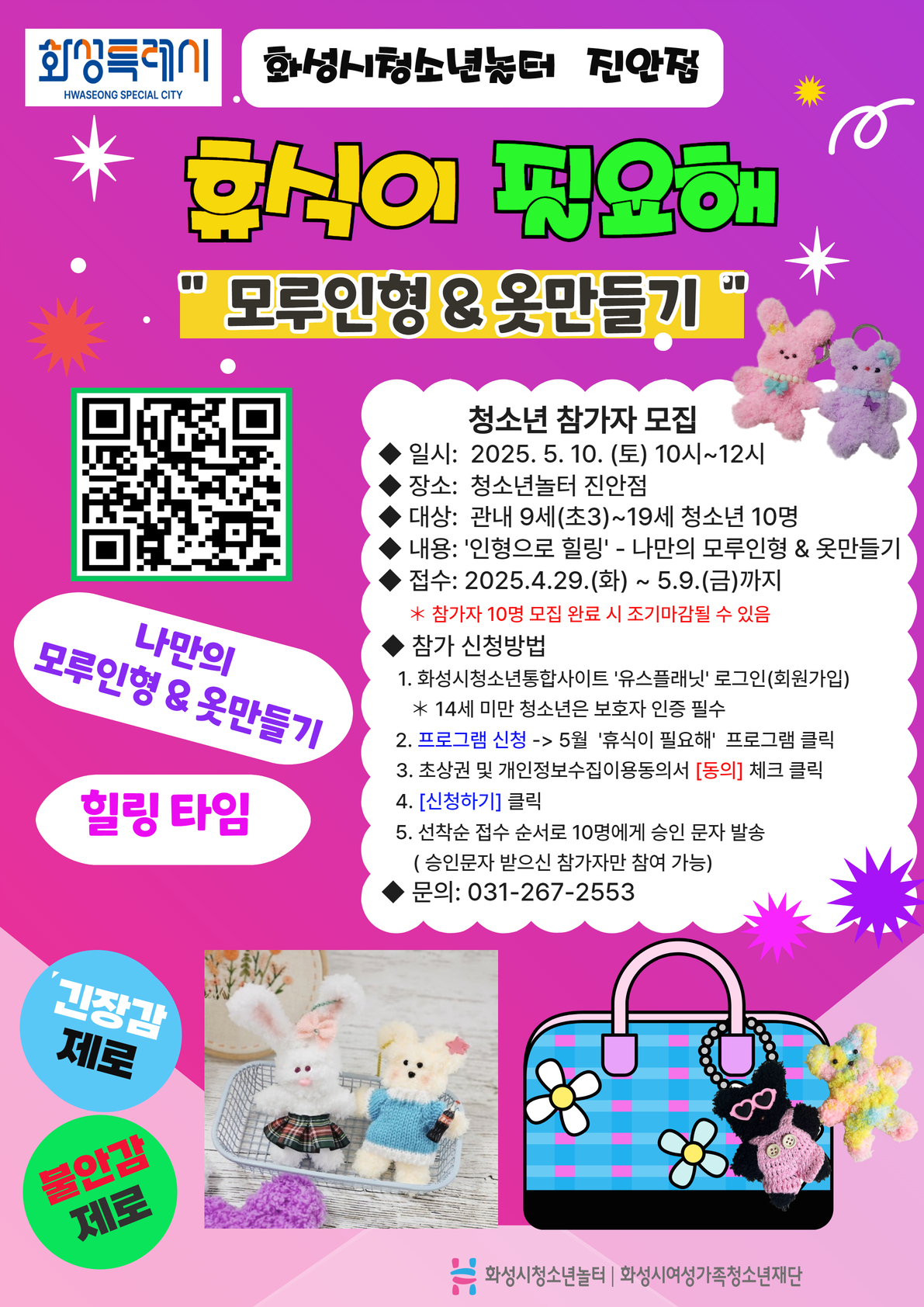 [청소년놀터 진안점] 5월 휴식이필요해 ‘모루인형 & 옷만들기’ 참가자 모집 일시: 2025. 5. 10.(토) 10:00~12:00 장소: 화성시청소년놀터 진안점 대상: 화성시 관내 9세(초3)~19세 청소년 10명 내용: 인형으로 힐링 - 나만의 ‘모루인형 & 옷만들기’ 접수: 2025.4.29.(화)~5.9.(금) ※ 참가자 10명 모집 완료 시 조기마감 될 수 있음 [참가 신청방법] 1. 화성시청소년통합사인트 ‘유스플래닛’ 로그인(회원가입) ※14세 미만 청소년은 보호자 인증 필수 2. 프로그램 신청 -> 5월 휴식이필요해 프로그램 클릭 3. 초상권 및 개인정보수집이용동의서 [동의] 체크 4. [신청하기] 클릭 5. 선착순 접수 순서로 10명에게 승인 문자 발송 (승인문자 받은 참가자만 참여 가능)