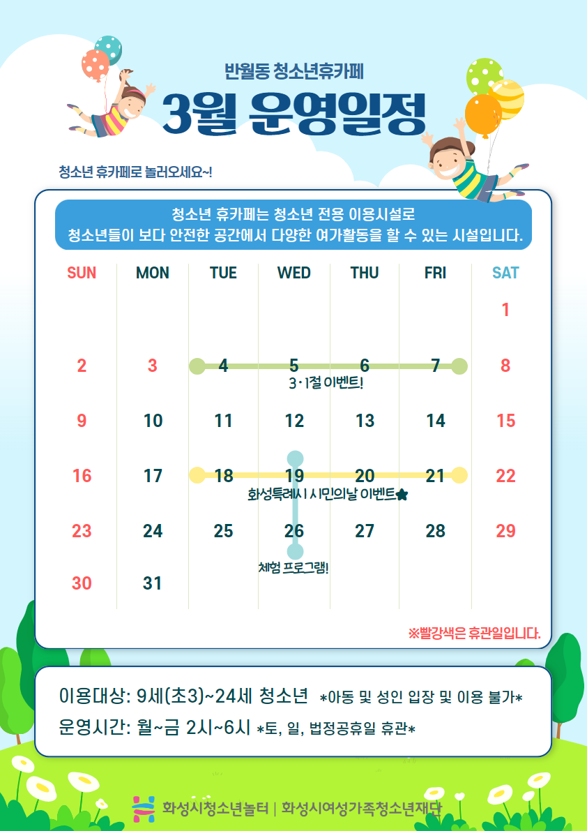 제목 [반월동 청소년 휴카페]3월 운영 일정 및 시설 안내