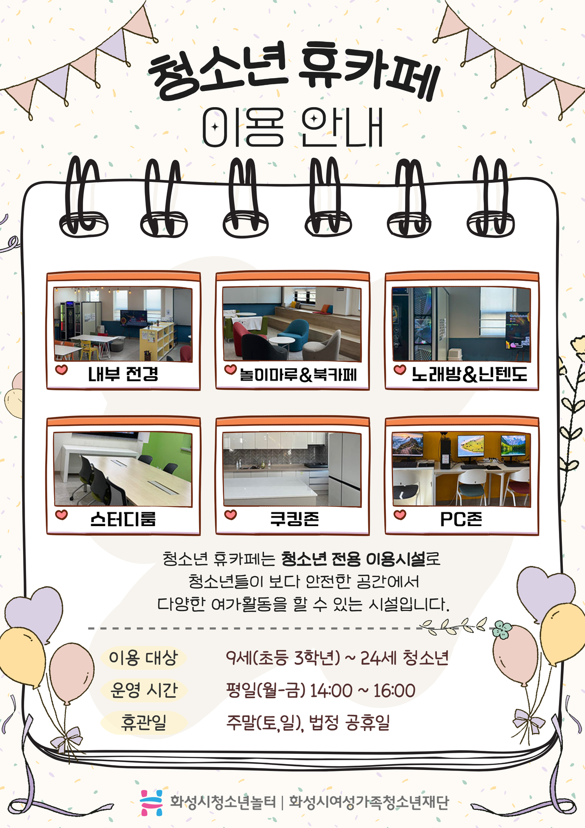 3) 운영 장소: 경기 화성시 영통로61번길 36 반월동 주민자치센터 3층 청소년휴카페