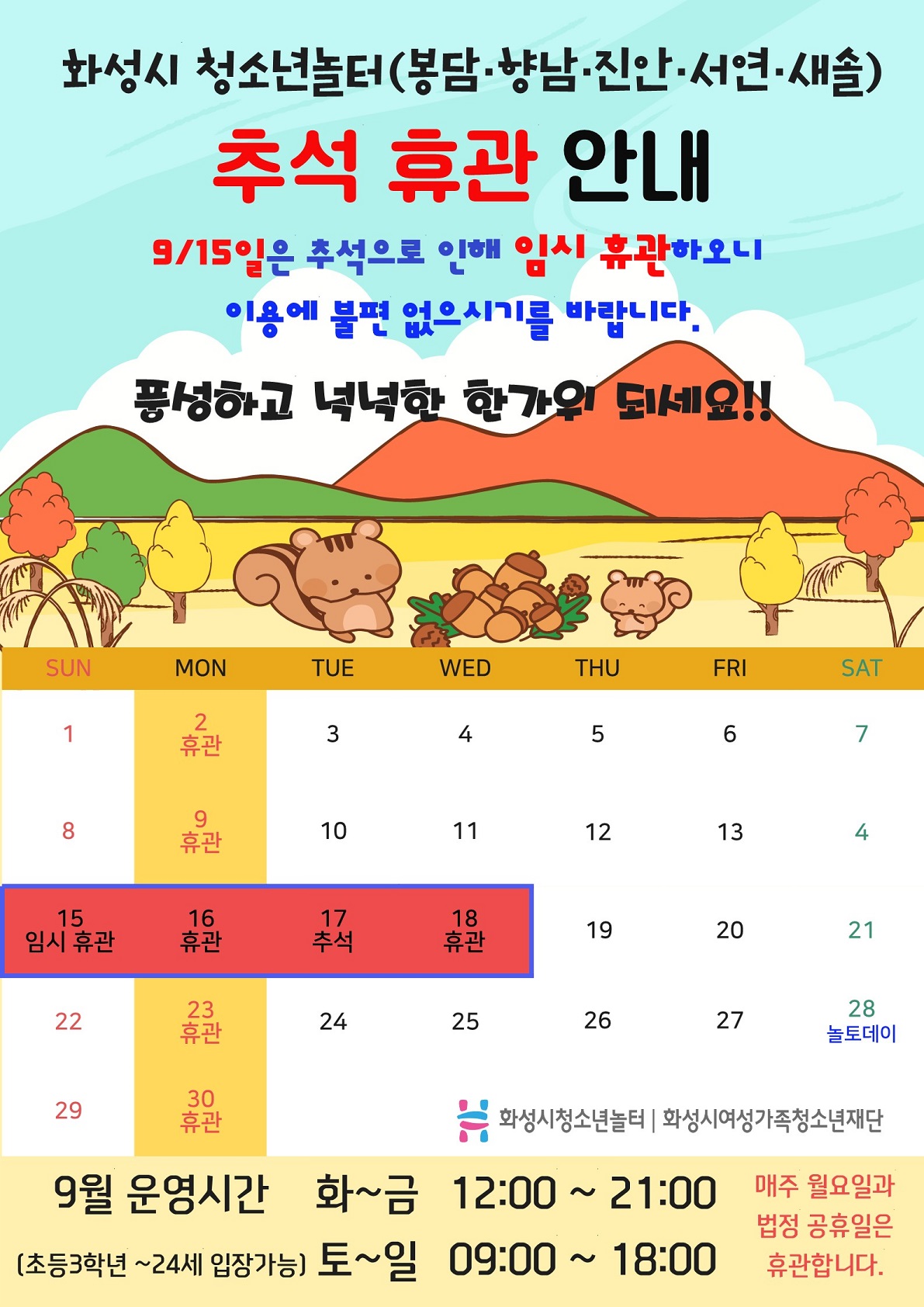 화성시청소년놀터(봉담·향남·진안·서연·새솔) 추석 연휴 휴관 일정입니다.