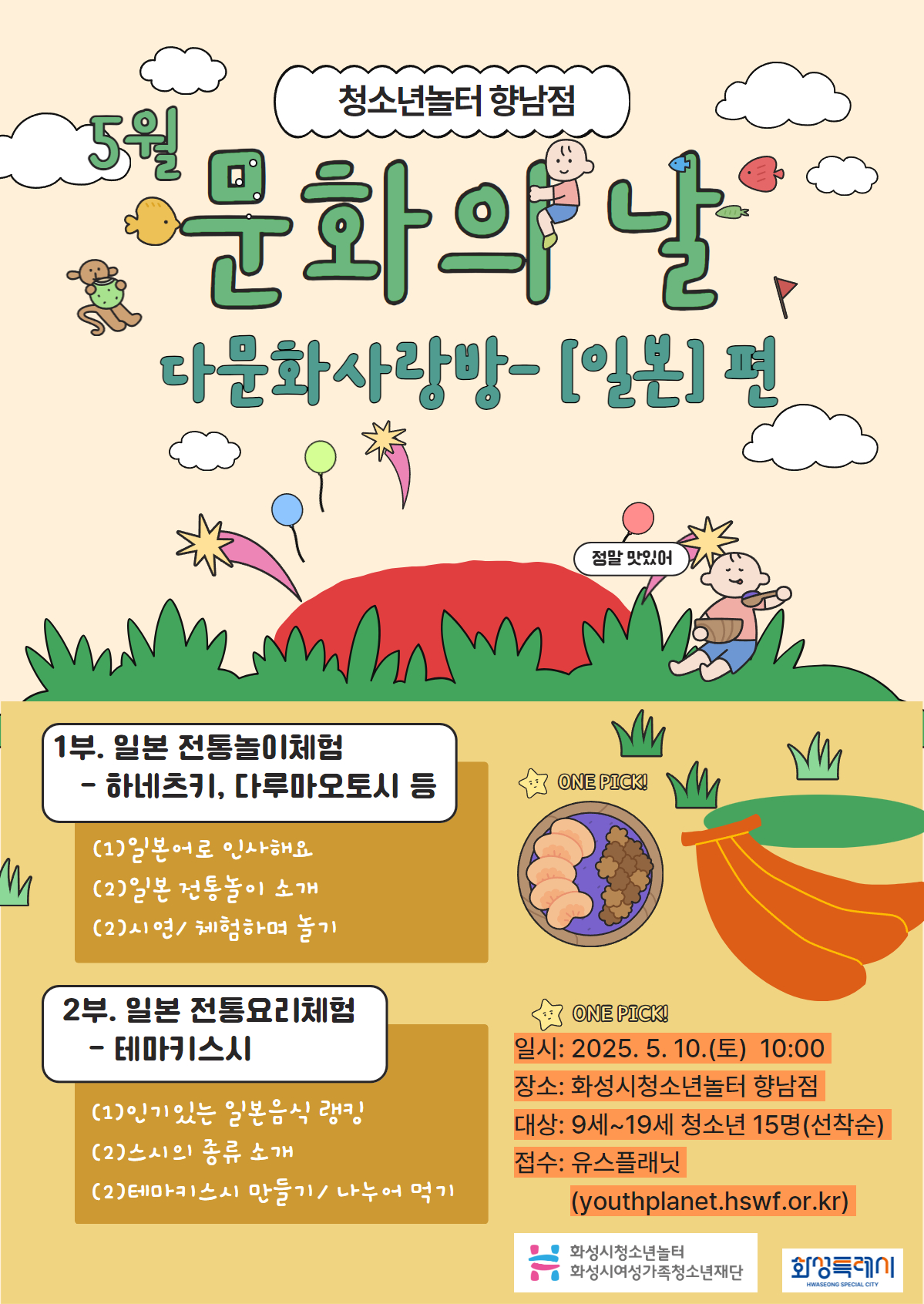 청소년놀터 향남점, 5월 문화의 날 프로그램 '다문화 사랑방' 안내 -- 세계문화체험프로그램, [일본] 편 2부. 일본 전통요리 체험 -- 테마키 스시 - 인기 있는 일본음식 랭킹을 알아봐요 - 스시의 종류에 대해 알아봐요 - 테마키 스시를 만들어봐요. 서로 나누어먹어요 2. 초상권 및 개인정보수집이용동의서 작성이 필요합니다(첨부문서 작성 후 제출) 3. 온라인 신청이 어려운 분은 놀터에 방문하시면 현장접수 도와드리겠습니다 많은 신청 바랍니다 |