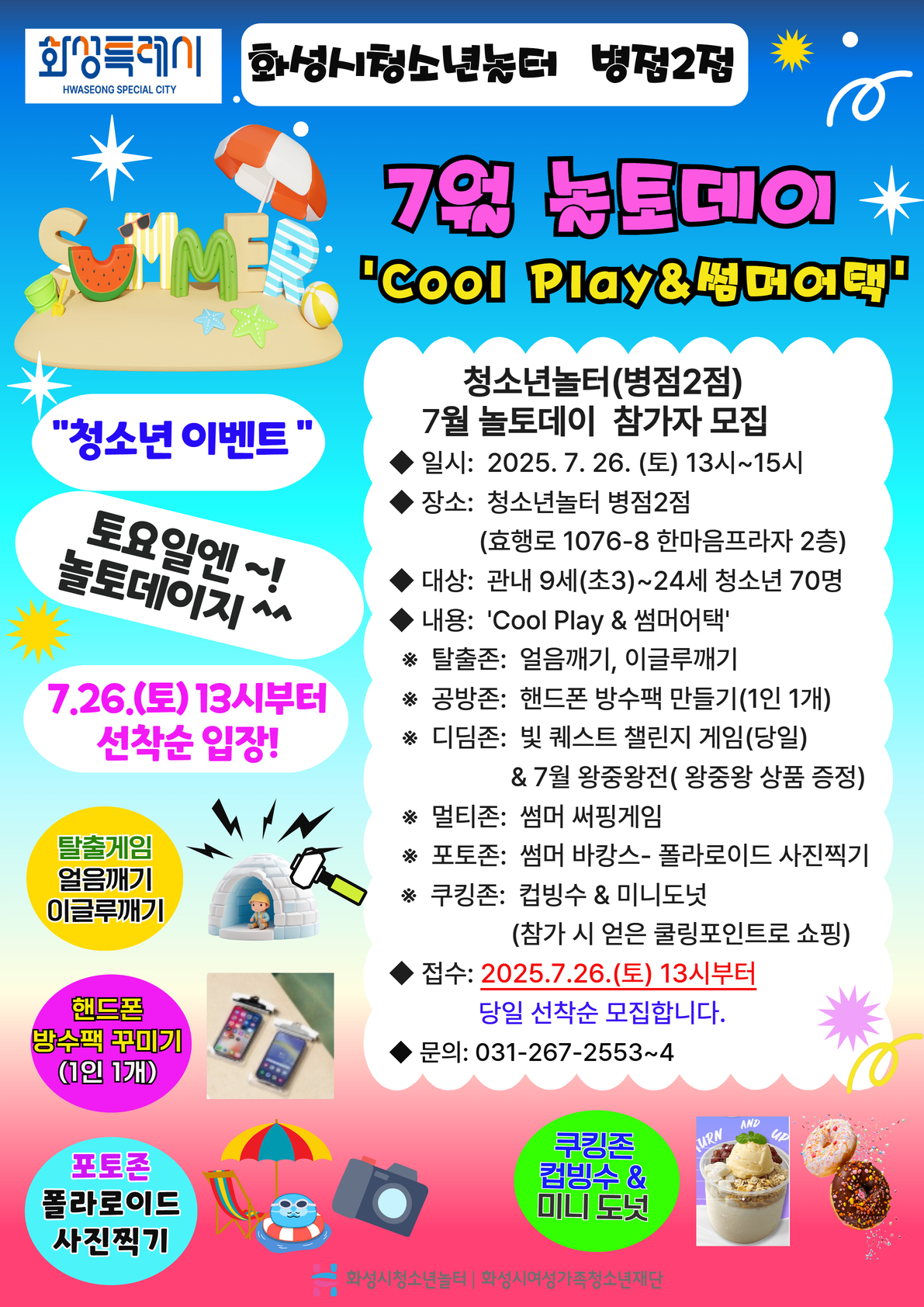 제목 [청소년놀터 병점2점] 7월 놀토데이 'Cool Play & 썸머어택’ 참가자 모집