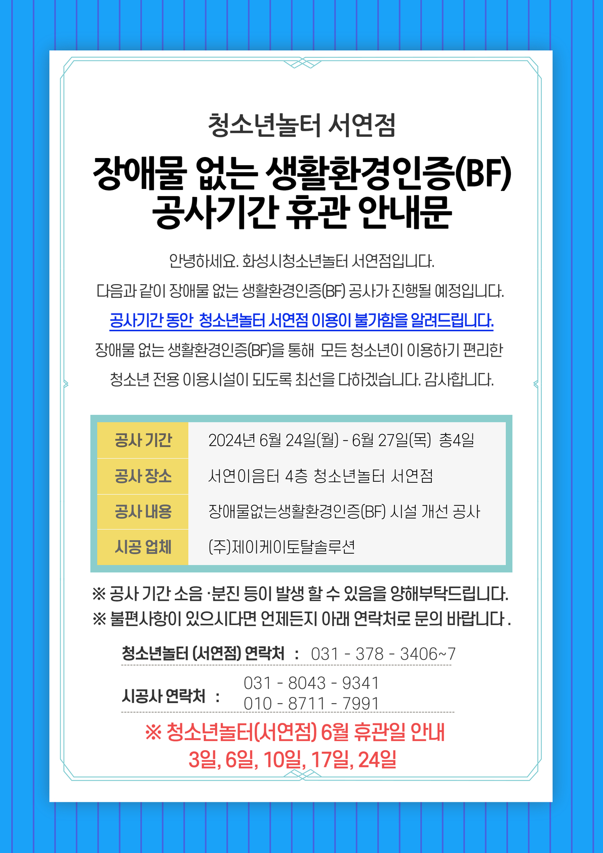 | 제목 | [청소년놀터 서연점] 장애물 없는 생활환경인증(BF) 시설 개선 공사 관련 임시 휴관 실시 안내 | |||||||||||||||
